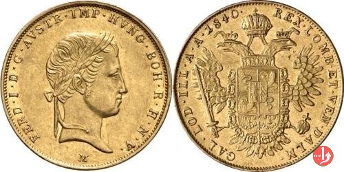 Testa laureata a destra. Nel giro FERD. I. D. G. AVSTR. IMP. HVNG. BOH. R. H. N. V. In basso il segno di zecca (A per Vienna, M per Milano, V per Venezia). Aquila bicipite dell'Impero Austriaco coronata e caricata dello stemma inquartato del Regno Lombardo Veneto con i simboli araldici di Milano e Venezia, in cuore scudetto Austriaco; sopra lo stemma, la Corona Ferrea ed intorno il Collare del Toson d'oro. Nel giro REX. LOMB. ET. VEN. DALM. - GAL. LOD. ILL. A. A. (millesimo).