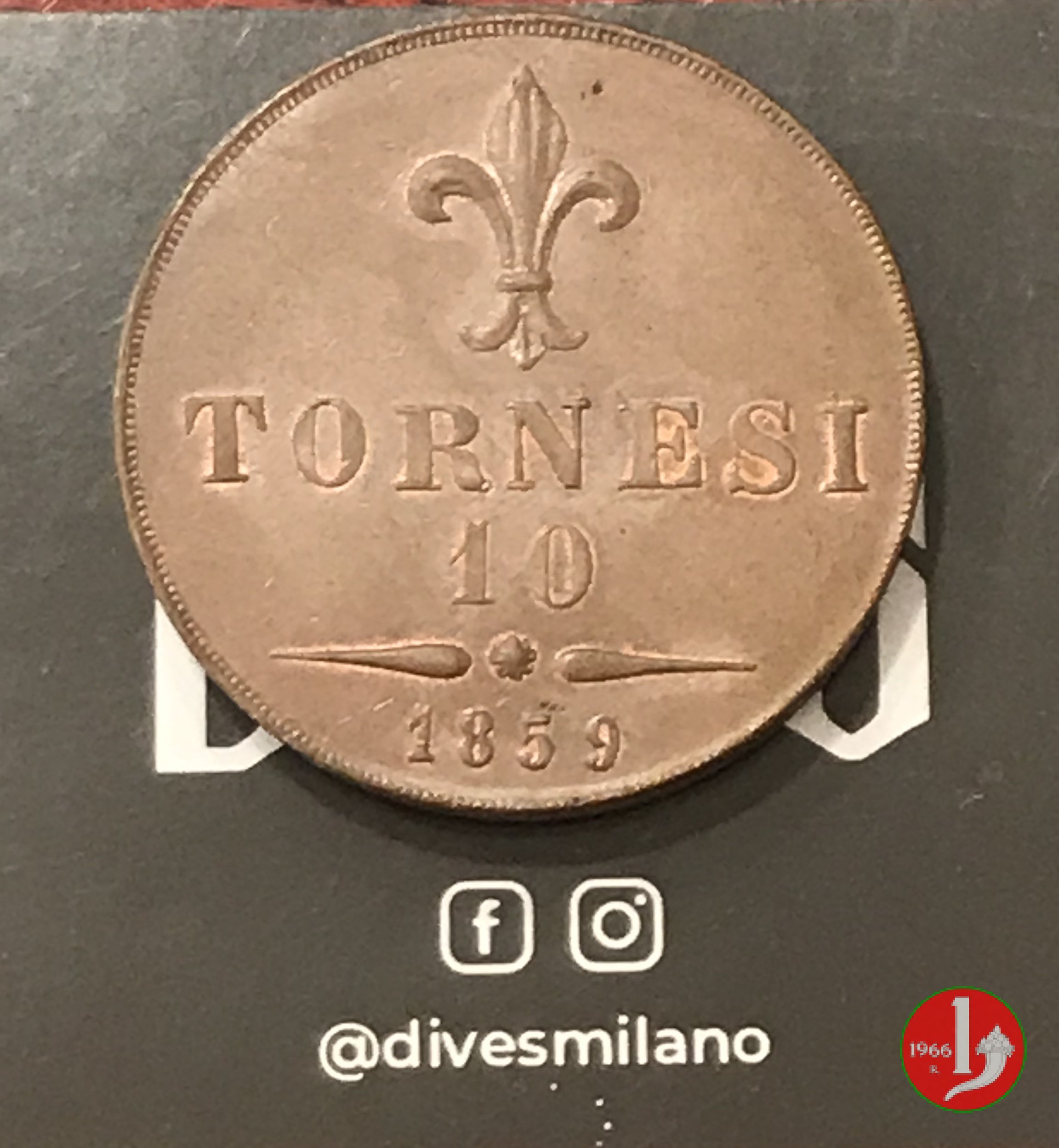 Secondo uno studio del prof. B.Cosentini del 1914, il quantitativo immesso in circolazione per il 10 tornesi tiratura di Napoli, seguí la sequenza quivi riportata: 4 febbraio 1860 - per ducati 7.200,00 28 aprile 1860 - per ducati 26.915,45 7 luglio 1860 - per ducati 51.682,20 26 settembre 1860 - per ducati 35.922,50 15 novembre 1860 - per ducati 32.560,25 per la somma di ducati 154.280,40 cui corrispondono poco piú di tre milioni di esemplari battuti. "I conii per tale quantità di monete furono 103, dei quali il 23 marzo 1861 in esecuzione di ordini superiori, furono rotti in zecca gli inutili nel n. di 83 e furono rimasti altri 20 che in parte erano in corso di lavorazione. Tali conii furono tutti chiusi in una cassa e conservati nel tesoro della Zecca, in attesa di ordini dalla direzione." [Rif. Rivista Numismatica ANNO IV - NUMERO 2 Aprile Giugno 1914] • TIRATURA DI ROMA Nel dicembre 1860 su esplicita richiesta del Re, il barone Salvatore Carbonelli già Ministro dei lavori Pubblici alla corte di Francesco II e poi Ministro delle Finanze di Roma, approvvigionò il rame per la produzione di monete da 10 tornesi resa indispensabile per i minuti pagamenti nell'esercito. Tra il 5 gennaio e il 16 aprile 1861 giunsero alla zecca di Roma, attraverso sei diverse spedizioni, kg 33.069 di rame in fogli, bande e tondini. Le monete furono impresse e successivamente racchiuse in 746 fusti del peso netto di kg 28.127 per un valore di 44.955 ducati. Questi dati sono riportati nel registro intestato "Zecca Pontificia di Roma Imballaggio di Monete" dove senza altra indicazione vennero elencati, dal 5 febbraio al 20 aprile 1861, le monete preparate e imballate ogni giorno con il valore espresso in ducati, la moneta di conto nel Regno, per cui non v'è dubbio alcuno sulla natura e la destinazione del numerario cosí valutato. [Rif. Giovanni Bovi; "I 10 tornesi romani di Francesco II e il Prestito di Gaeta", B.C.N.N. gennaio-dicembre 1974-1975] Per la coniazione delle monete di Roma, furono utilizzati i conii rifatti dal punzone originale proveniente dalla zecca di Napoli e preparati dall'incisore Bonfiglio Zaccagnini. [Rif. Neri Scerni; Rivista italiana di Numismatica e Scienze affini, serie V, vol. LXXV, 1973] Contrariamente a quanto ipotizzato in passato, anche i 10 tornesi coniati a Roma sono costituiti da rame ad elevata purezza. [Rif. Carmelo R. Crupi; Cronaca Numismatica, 13 Giugno 2019] Prima della loro immissione in circolazione queste monete vennero sottoposte a processo di invecchiamento artificiale in acido. Oltreché per il suddetto trattamento le monete di Roma, in cui normalmente non risultano visibili alla base del collo le iniziali dell'incisore L.A., si differenziano dalla tiratura di Napoli per la diversa inclinazione della cordonatura del taglio. Al diritto, il busto del sovrano ha la punta del naso piú arrotondata e la riga del capelli sulla tempia di forma diversa. Al rovescio, la cifra 9 del millesimo 1859 è piú distante e leggermente inclinata. Inoltre la scritta TORNESI è disallineata nei tre gruppi TO-RNE-SI. | ||||||||||||