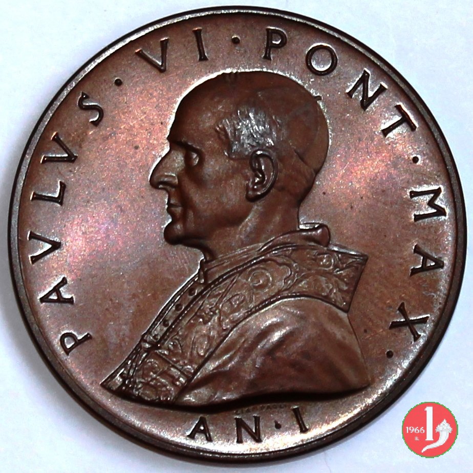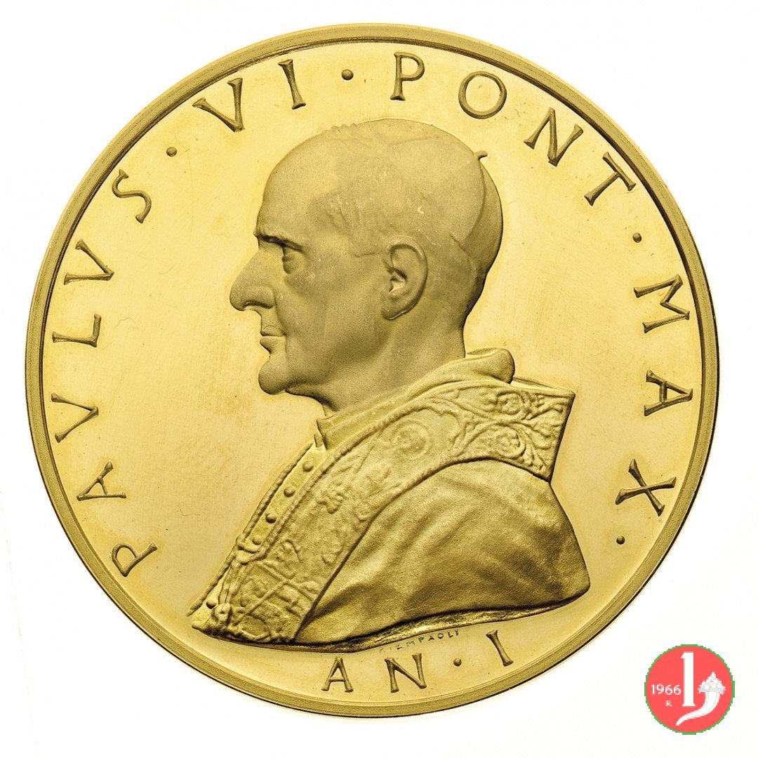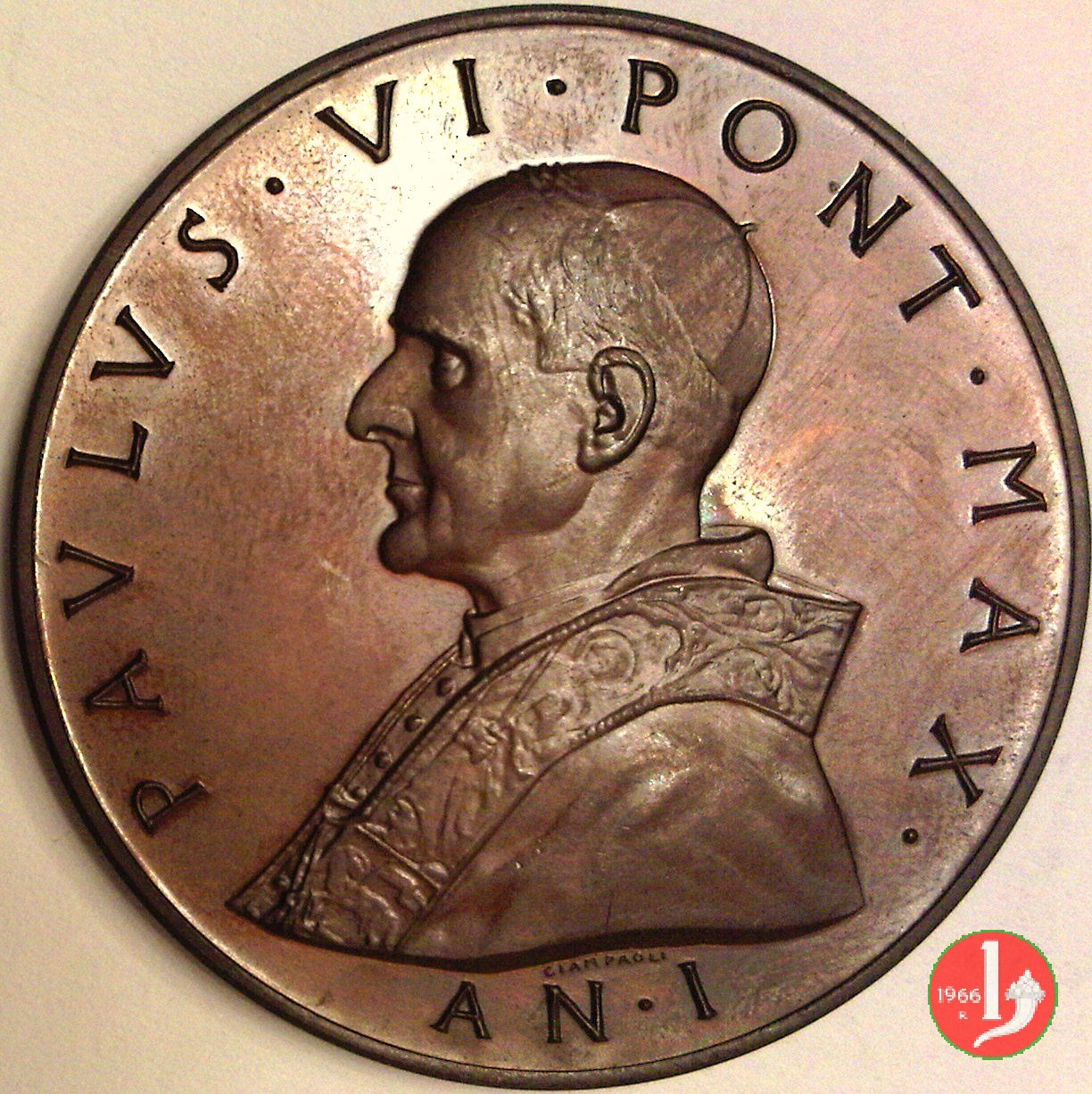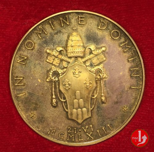 Medaglia annuale coniata, emessa il 29-06-1963 con fondo opaco o lucido, a ricordo dell'elezione al Pontificato di Paolo VI. Vi sono varietà nel titolo dell'argento e nel marchio dello Stabilimento di coniazione della medaglia. | ||||||