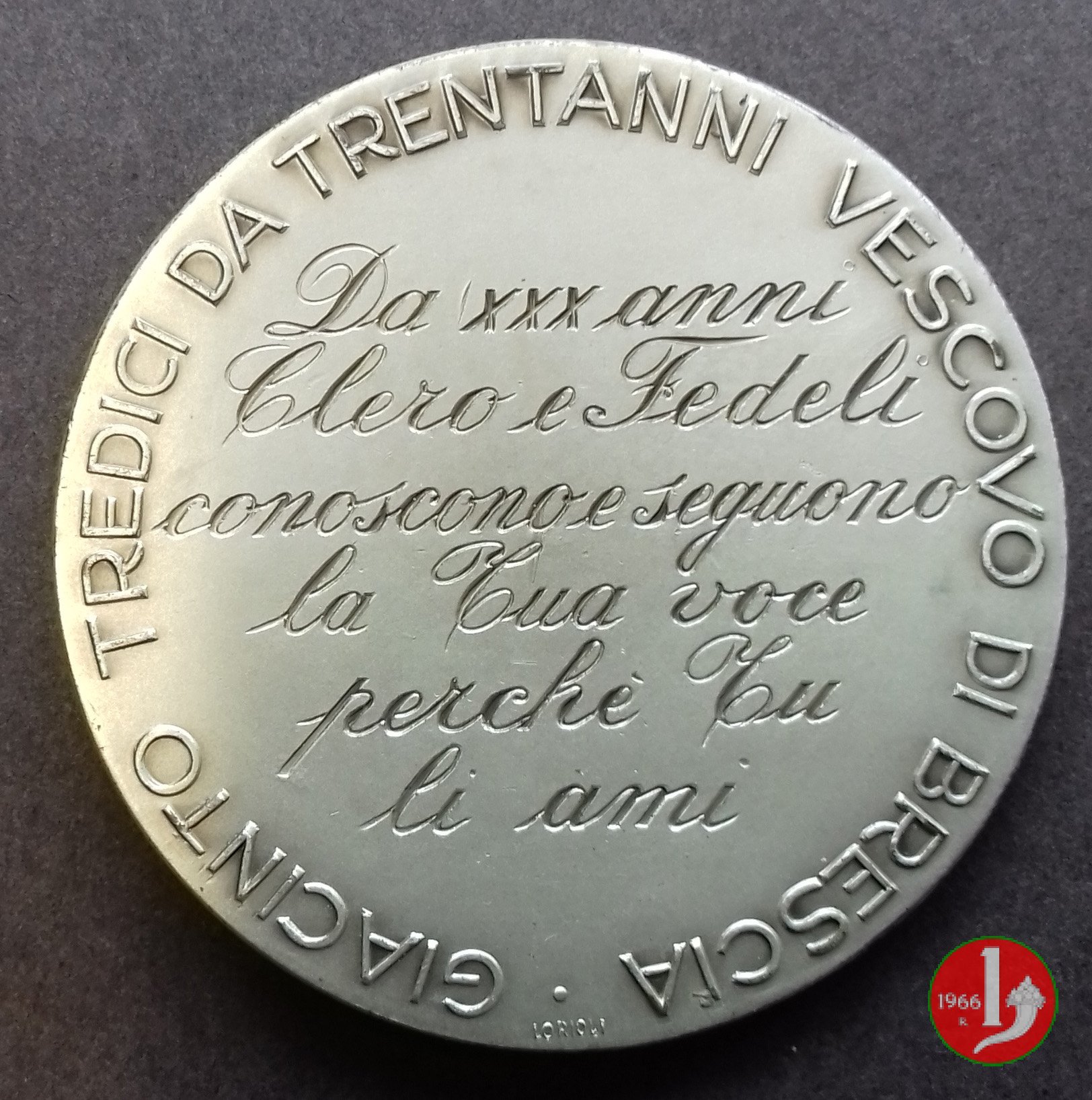 | Medaglia coniata, realizzata nel 1963 a ricordo del trentesimo anniversario della nomina di Giaconto Tredici a Vescovo di brescia. | |||||