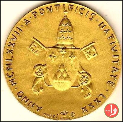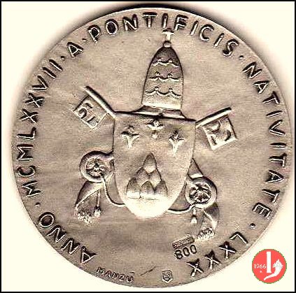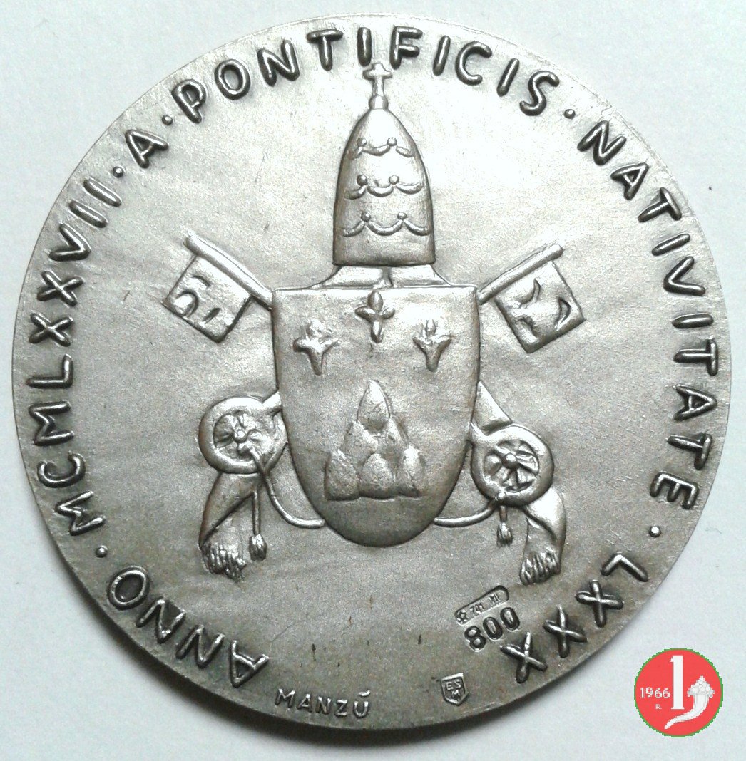 | Medaglia straordinaria coniata, emessa il 26-09-1977 dallo Stabilimento Emilio Senesi di Milano, per ricordare l'ottantesimo compleanno di Papa Paolo VI. | |||||||