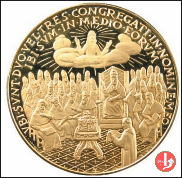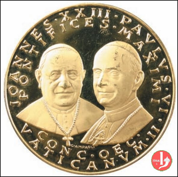 Medaglia straordinaria Privata coniata senza data, ma probabilmente realizzata nel 1965 per ricordare la chiususra dei lavori del Concilio Ecumenico Vaticano II. Medaglia conclusiva 21° della serie composta, oltre alla presente, da 20 medaglie dei seguenti pontefici: Silvestro I - Damaso I - Celestino I - Leone I - Virgilio I - Agatocle I - Adriano I - Adriano II - Callisto II - Innocenzo II - Alessandro III - Innocenzo III - Innocenzo IV - Gregorio X - Clemente V - Martino V - Eugenio IV - Giulio II e Leone X - Paolo III, Giulio III e Pio IV - Pio IX. | ||||||