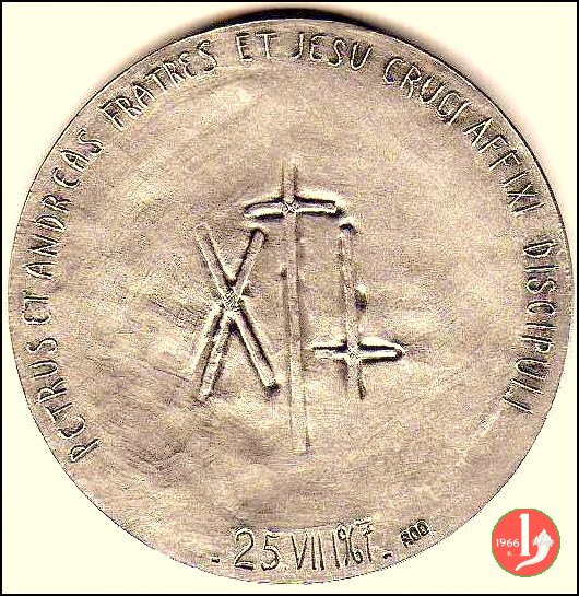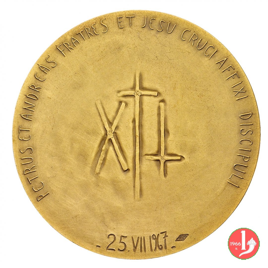 Medaglia straordinaria ufficiale coniata, emessa il 25-07-1967, a ricordo dell'incontro tra Paolo VI e il Patriarca Athenagoras. L'iconografia del V rappresenta le Crocifissioni di Pietro ed Andrea e quella di Cristo che hanno unito gli Apostoli, divenuti fratelli e discepoli anche nel dolore. | |||||||
