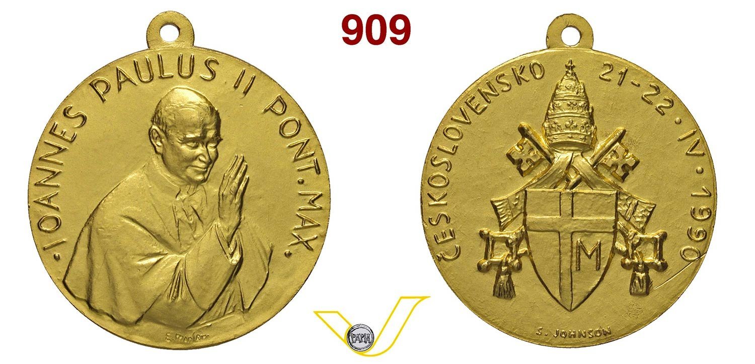Medaglia straordinaria coniata, emessa il 21-04-1990 dallo Stabilimento Stefano Johnson di Milano per la Segreteria di Stato Vaticana, per ricordare il Viaggio Apostolico in Cecoslovacchia.
