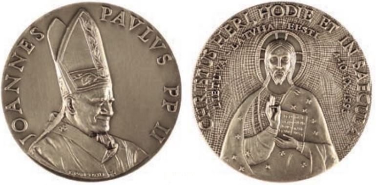 | Medaglia coniata, emessa il 04-09-1993 con fondo opaco dallo Stabilimento Stefano Johnson di milano, per ricordare la viaggio Apostolico in Lituania, Lettonia ed Estonia. | |||||||