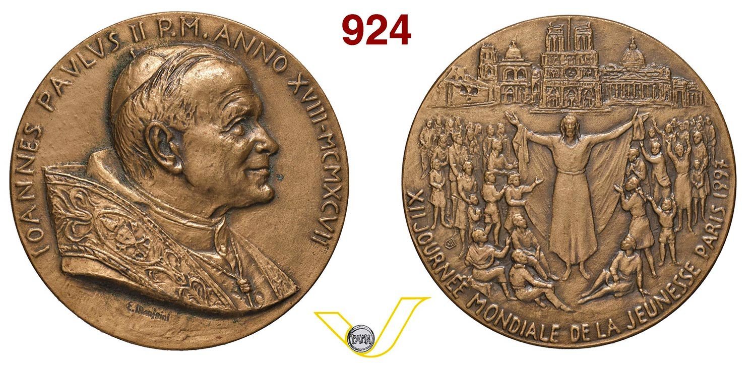 Medaglia coniata, realizzata nel 1997, con fondo opaco o satinato, per ricordare la XII Giornata Mondiale della Gioventú a Parigi dal 19 al 24 agosto 1997. Il Tema è stato un passo del Vangelo di Giovanni: "Maestro dove abiti? Venite e vedrete". Presenta l'errore dell'Anno di pontificato al Dritto. | ||||||