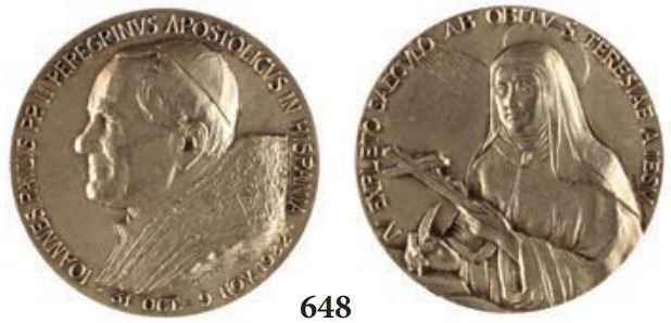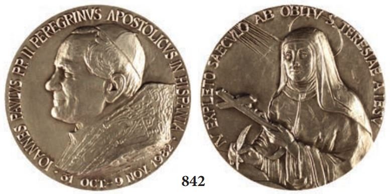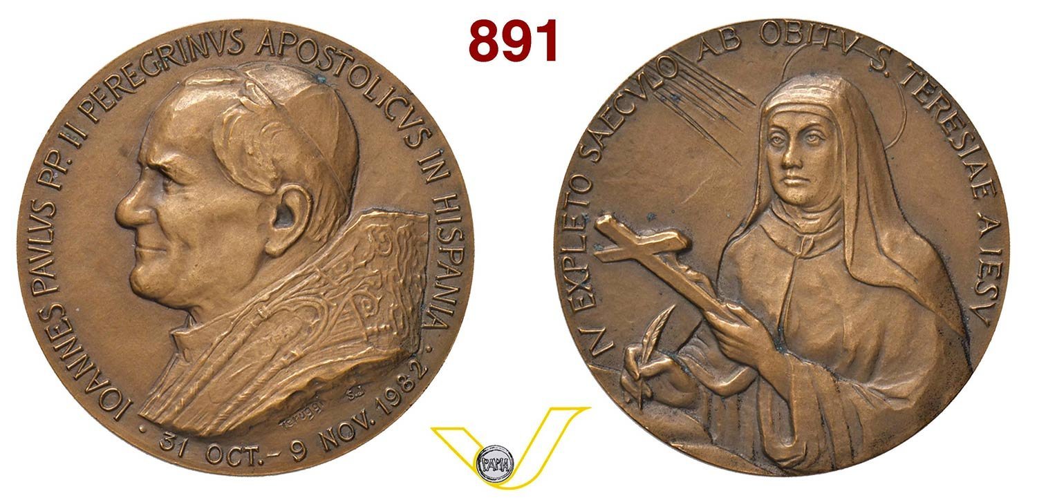 | Medaglia straordinaria coniata, emessa il 31-10-1982, con fondo opaco, dallo Stabilimento Stefano Johnson di Milano, per ricordare la visita Apostolica in Spagna in occasione del IV Centenario della Morte di Santa Teresa del Bambin Gesú. | |||||||