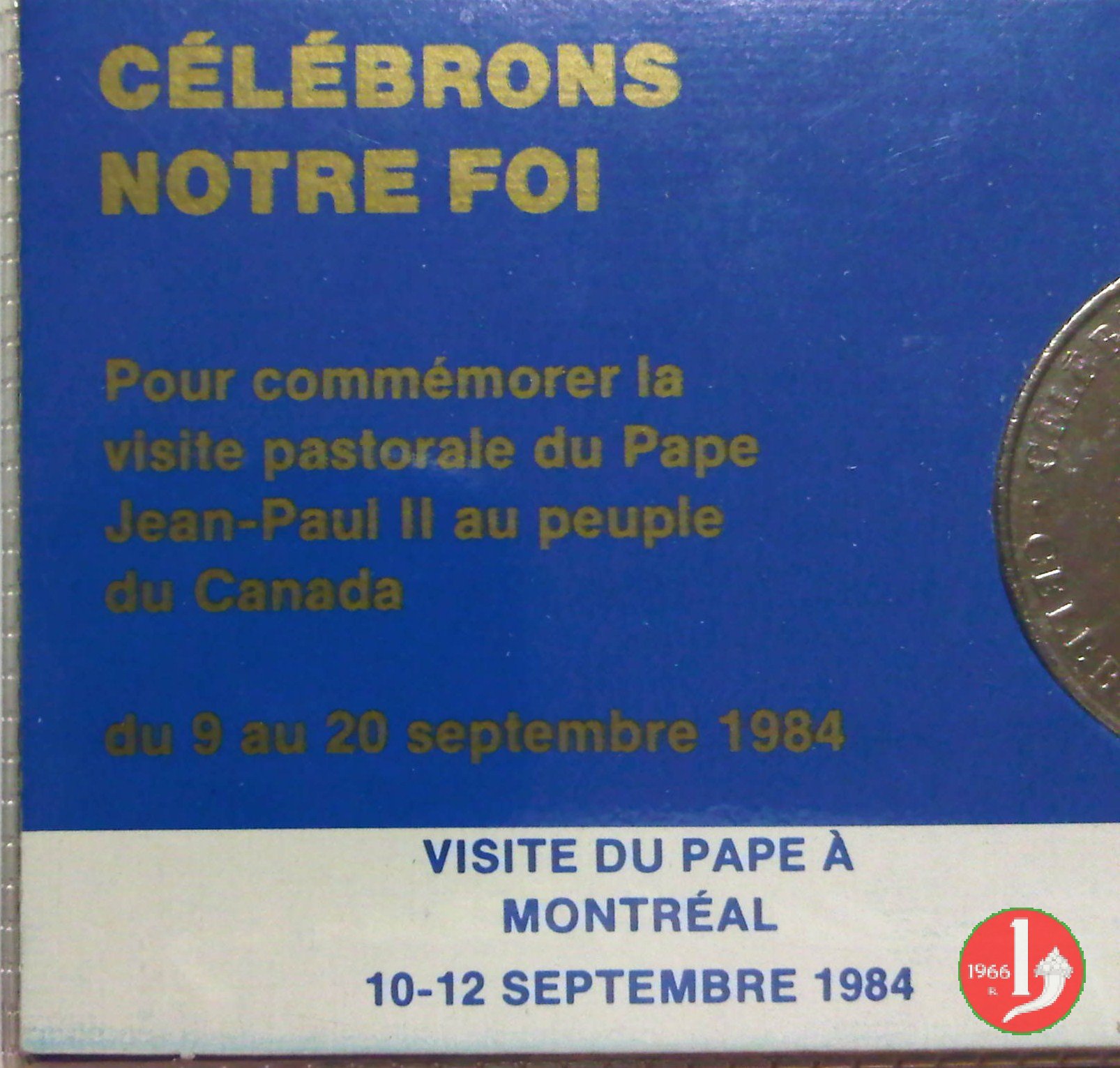 | Medaglia coniata, emessa il 10-09-1984, per ricordare la visita Apostolica a Montreal. | ||||