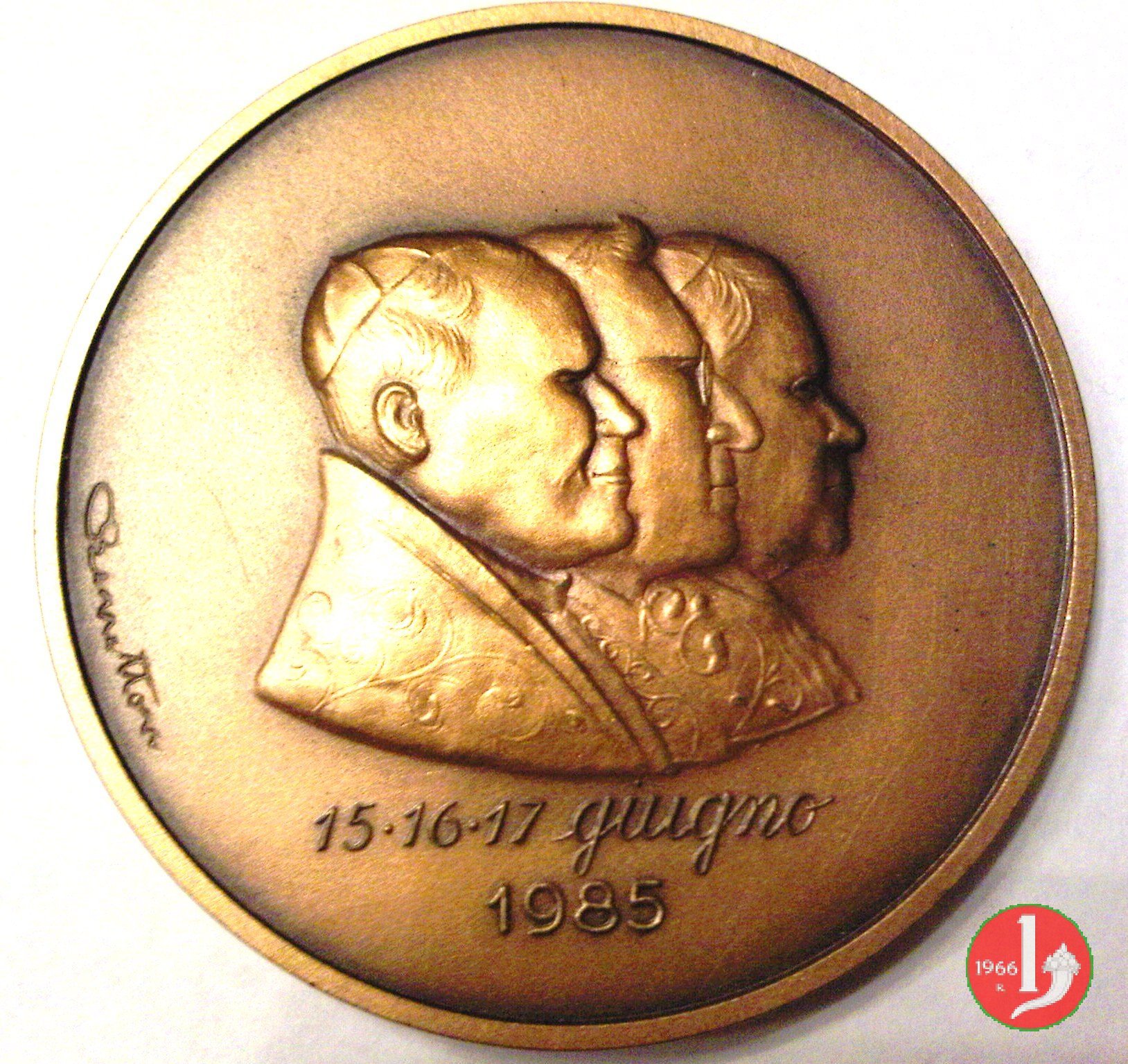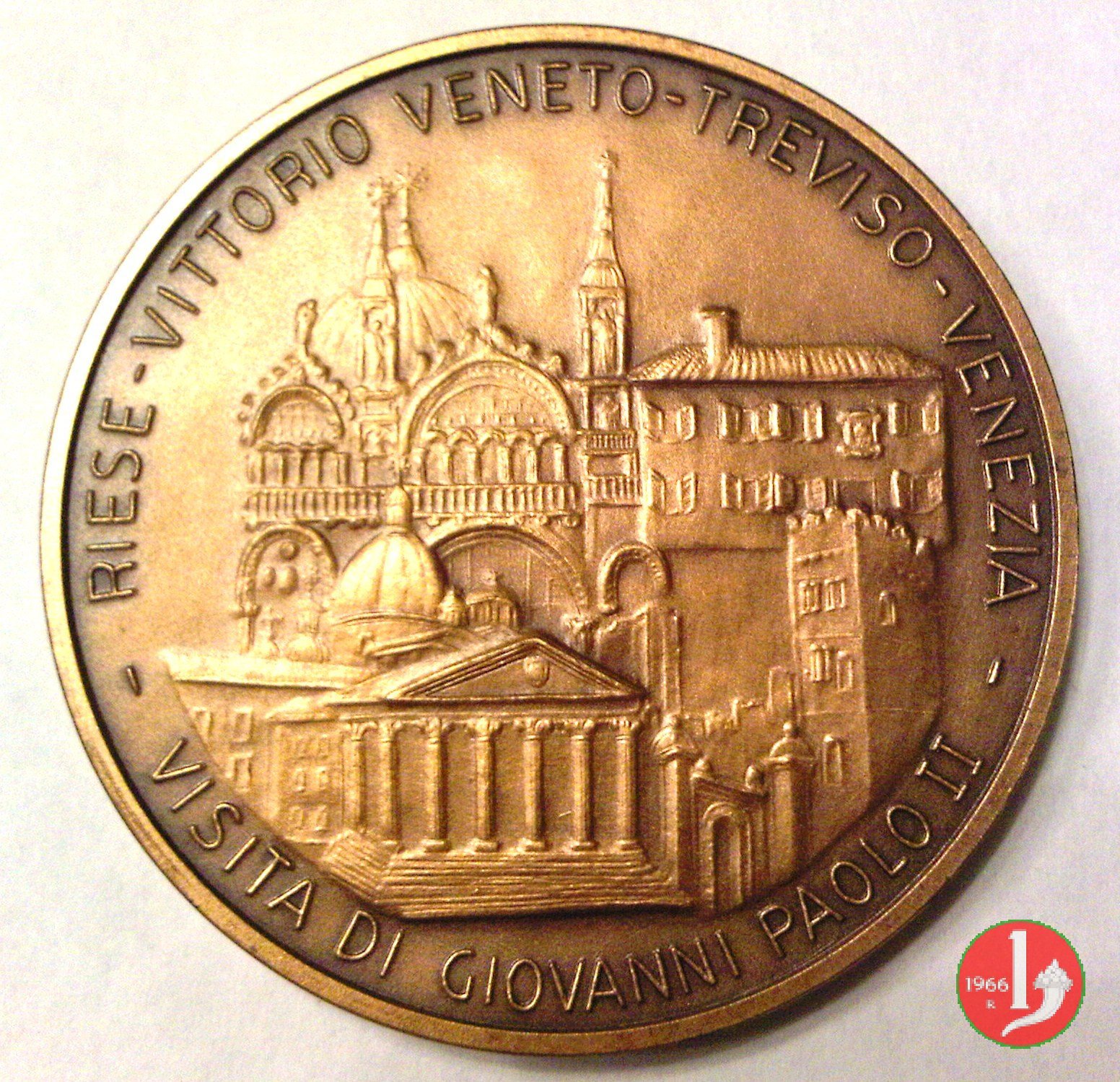 | Medaglia coniata, emessa il 15-06-1985, con fondo opaco, per ricordare la Visita Pastorale a Riese, Vittorio Veneto, Treviso e Venezia. | ||||||