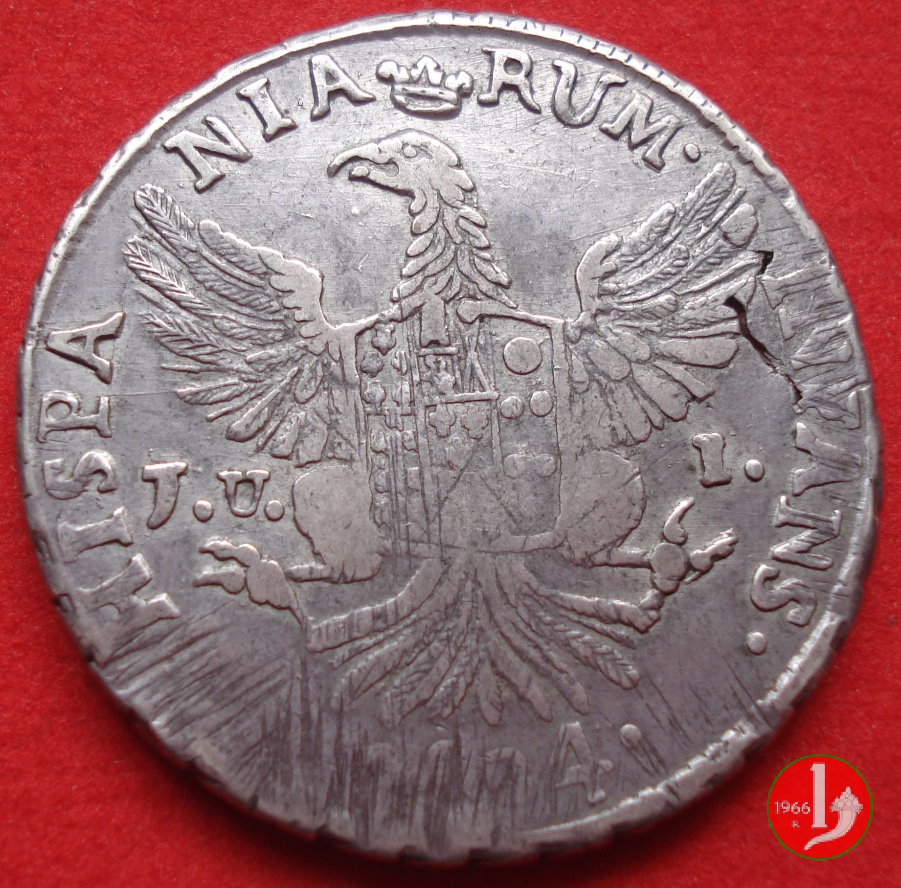 Aquila coronata con stemma sul petto volta a sinistra, sotto le ali J • U / I •