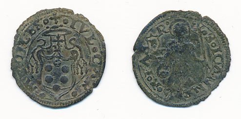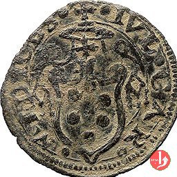 ✠°IVL°CAR°__°MEDICES° / stemma cardinalizio (dei Medici) a targa sormontato da crocetta e cappello. Contorno lineare. °S°IOANNE__S°FAB__R° / Il Santo nimbato, in piedi di fronte, tiene nella destra una fascia e nella sinistra una lunga croce; a sinistra in alto nel giro armetta della città. Contorno lineare.