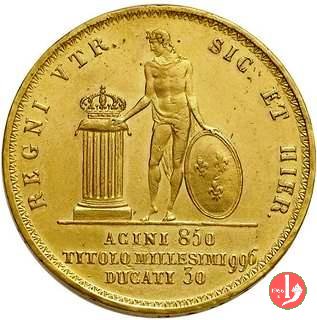 Di questa moneta sono note, ad oggi, sei diverse tipologie: a) - al D/, testa imberbe giovanile; al V/, Genio alato e in esergo peso in ACINI; b) - al D/, testa barbuta; al V/, Genio alato e in esergo peso in ACINI; c) - al D/, testa barbuta; al V/, Genio alato e in esergo peso in TRAPPESI; d) - al D/, testa grande e barbuta; al V/, Genio alato e in esergo peso in TRAPPESI; e) - al D/, testa piccola e barbuta; al V/, Genio alato e in esergo peso in TRAPPESI. Le caratteristiche dell'effigie, della legenda e del contorno furono definite dal Decreto n°268 del 27 Aprile 1831. Questa moneta era nota anche con il nome Decupla. | ||||||||||||||