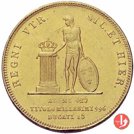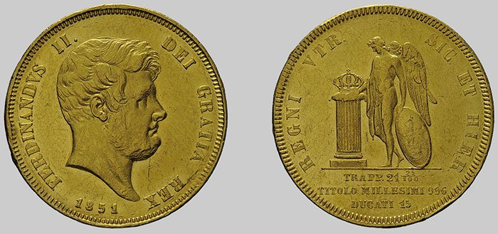 Di questa moneta sono note, ad oggi, tre diverse tipologie: a) - al D/, testa imberbe giovanile; al V/, in esergo peso in ACINI; b) - al D/, testa barbuta; al V/, Genio alato e in esergo peso in TRAPPESI; c) - al D/, testa barbuta adulta; al V/, Genio alato e in esergo peso in TRAPPESI. Le caratteristiche dell'effigie, della legenda e del contorno furono definite dal Decreto n°268 del 27 Aprile 1831. Questa moneta era nota anche con il nome Quintupla. | ||||||||||