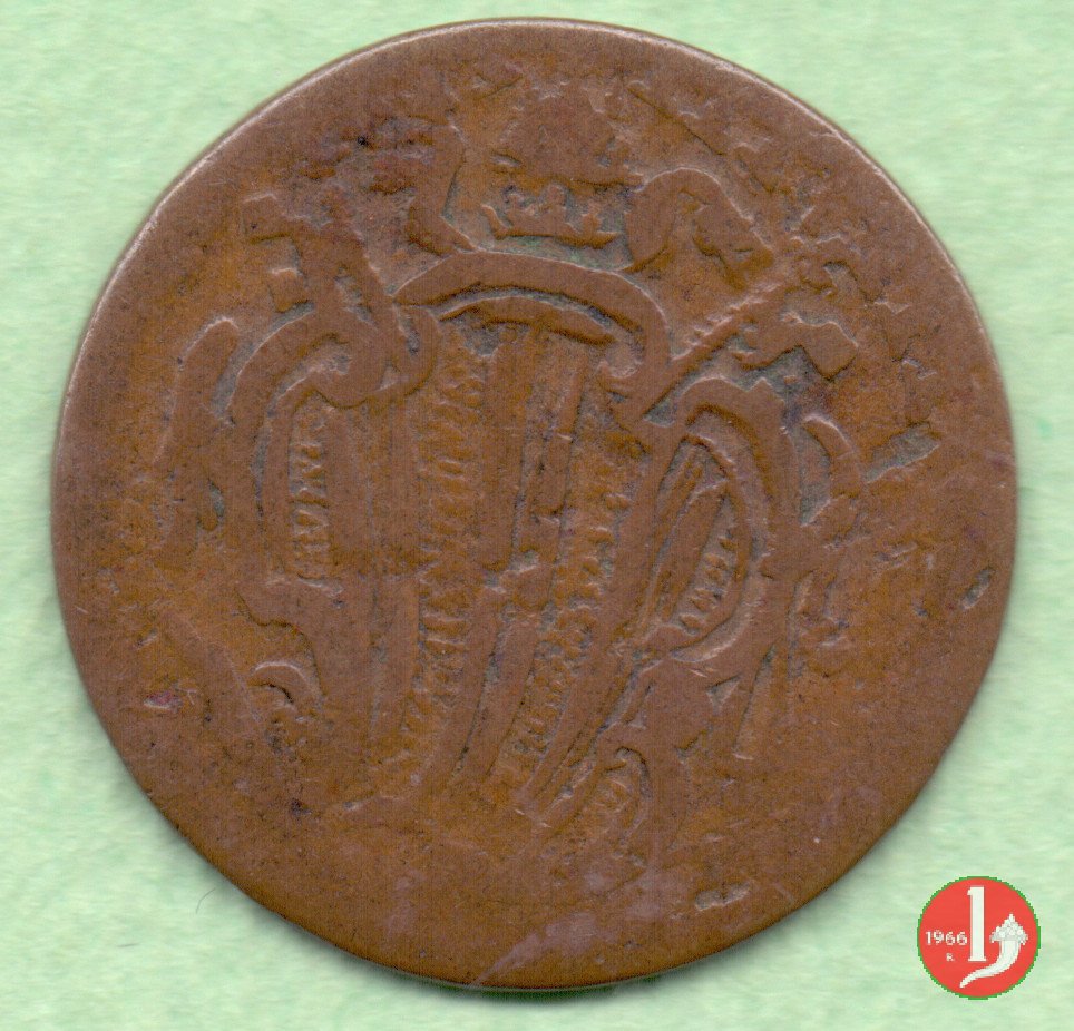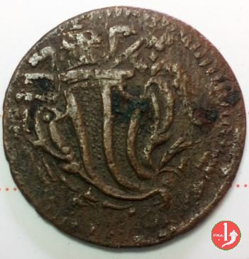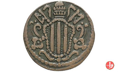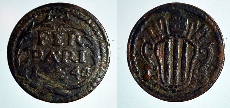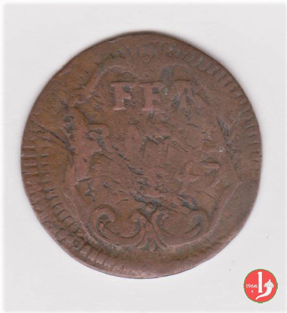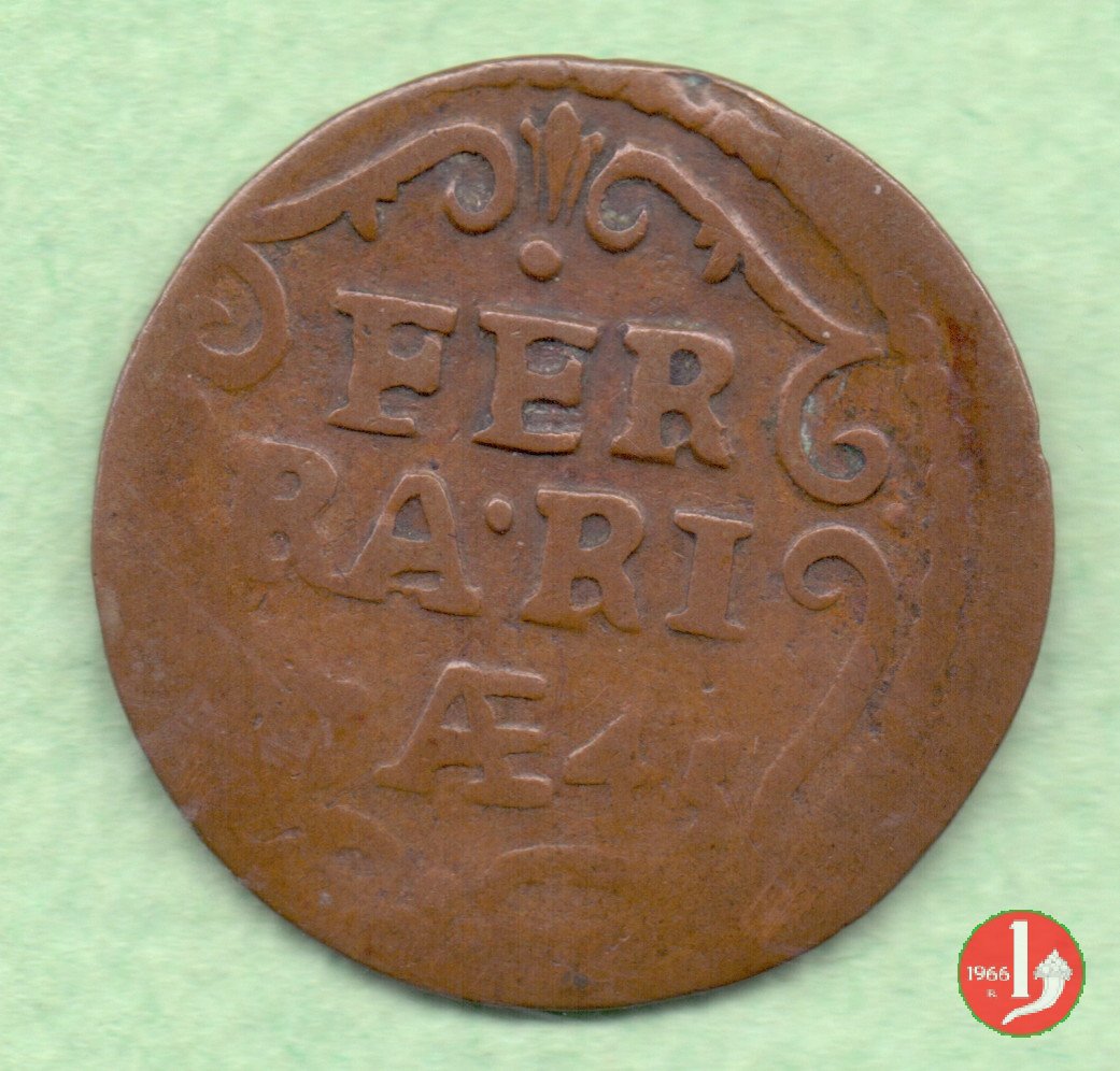 Anepigrafe. Stemma semiovale e poligonale, con due ricci ai lati, sovrapposto a chiavi decussate e sormontato da tiara. FER / RA • RI / 17 AE 44 / in cartella di sei ornati a volute lineari, con globetto sopra e sotto.