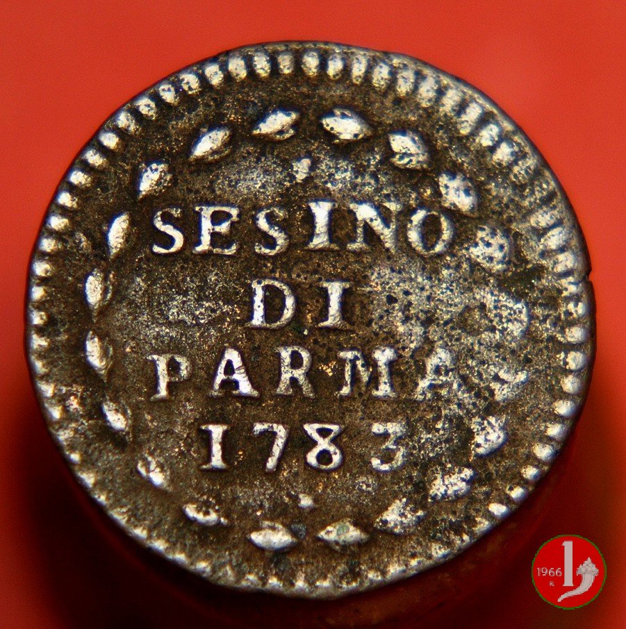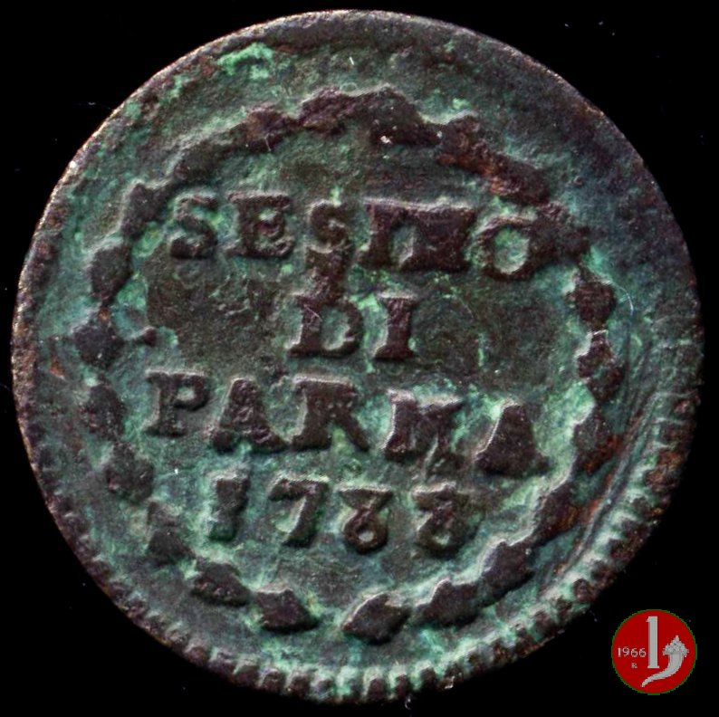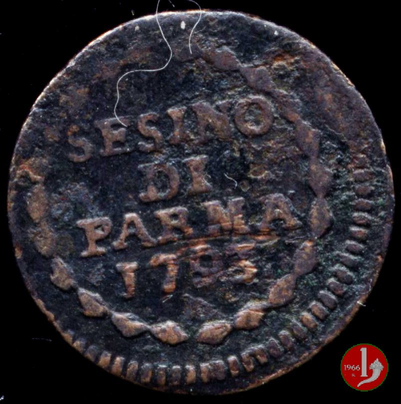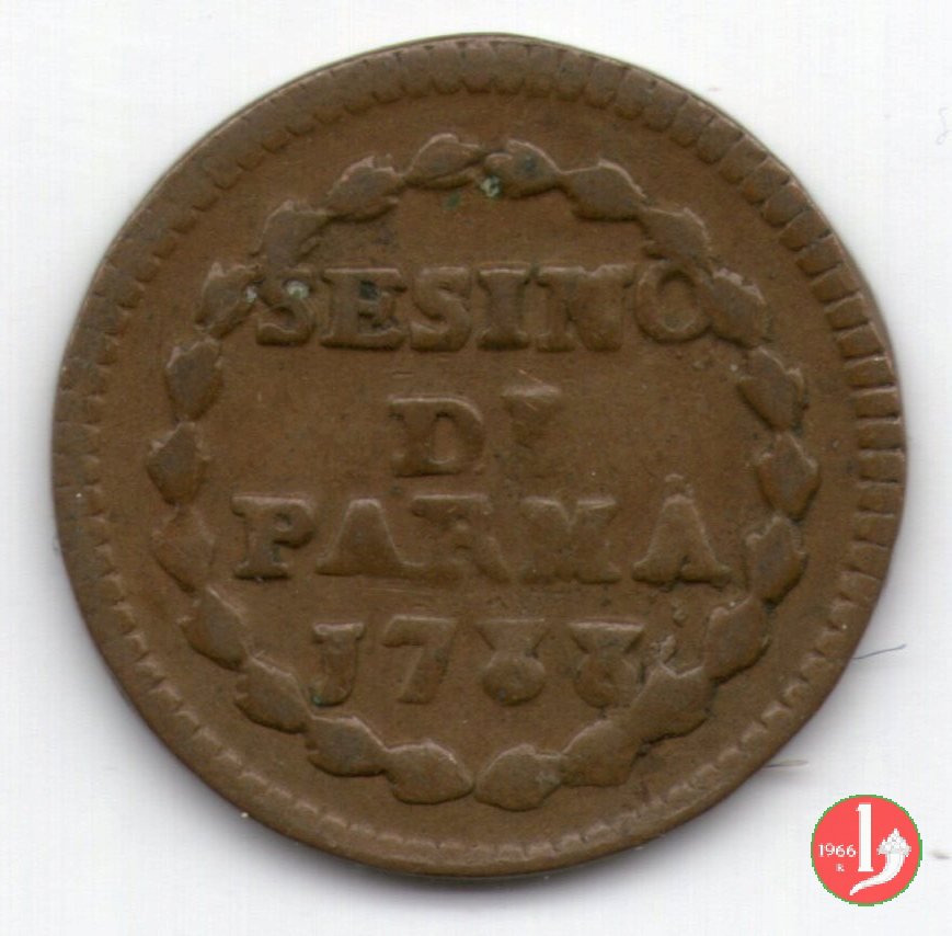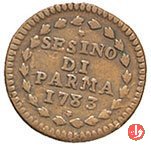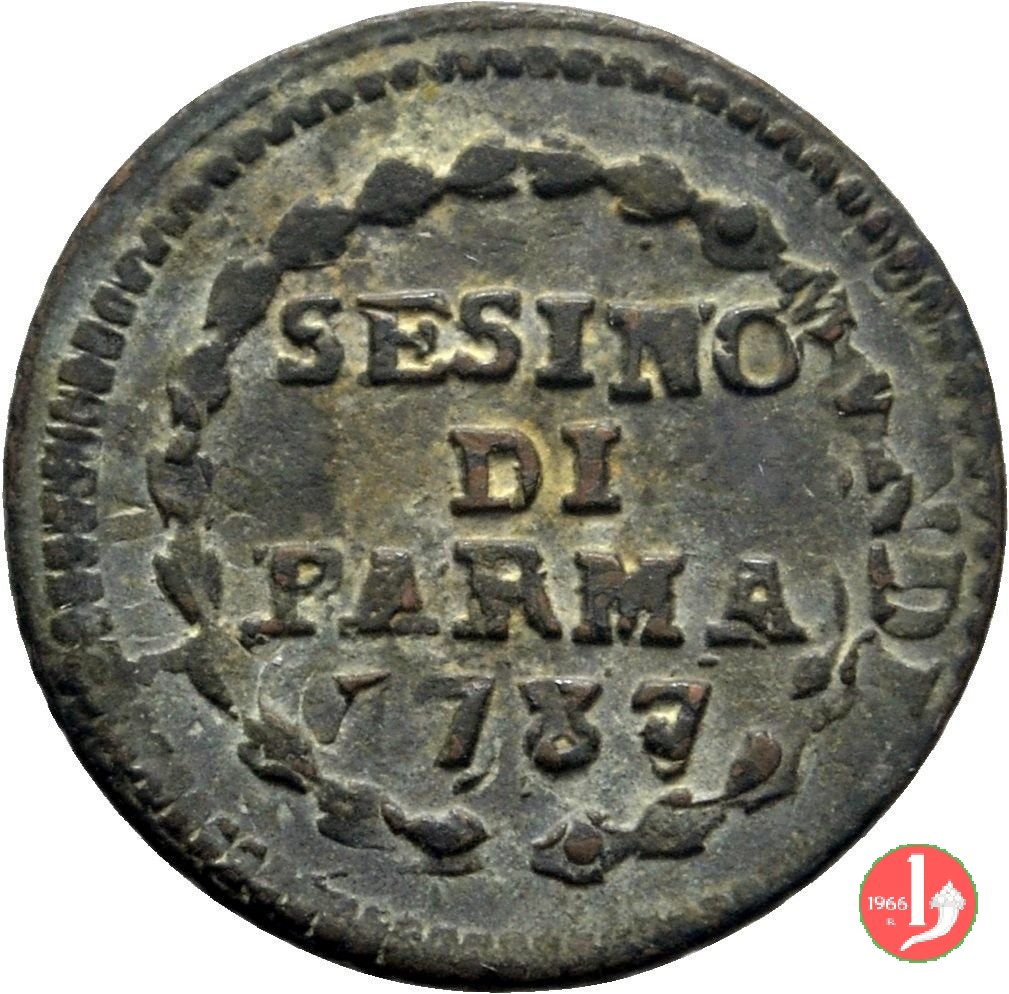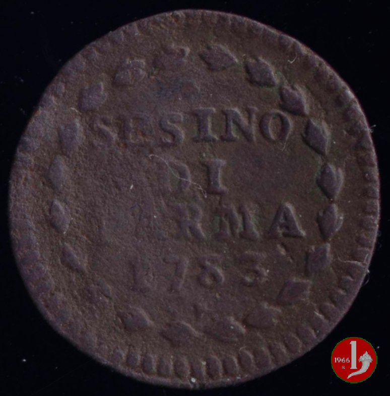 Cod. W-FERD/0-0:9381 B. 1783B, CNI assente: D\ FERD • I • D • G • H • I • PA • PLA • ET V • DUX •, stemma coronato entro cerchio di grani. R\ ![]() // SESINO // DI // PARMA // 1783 // ![]() entro corona d'alloro.