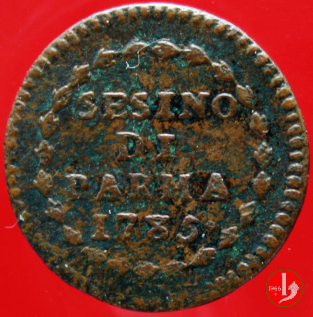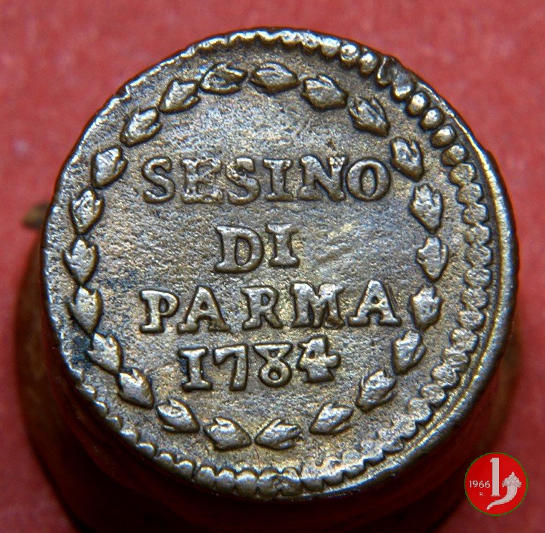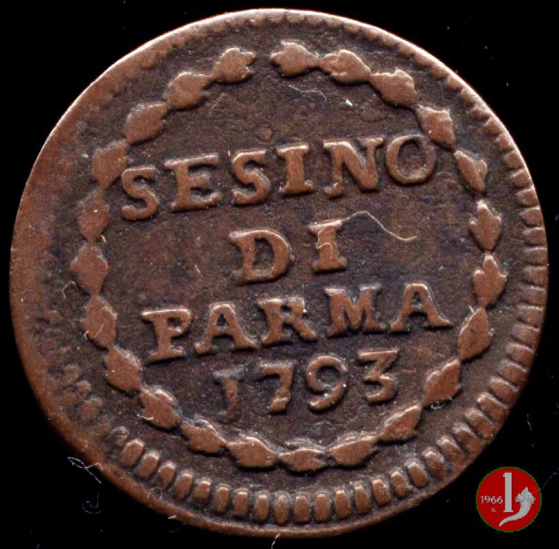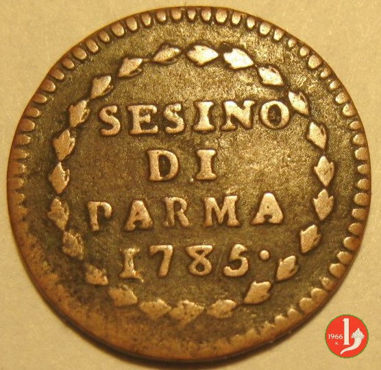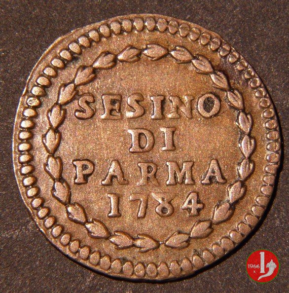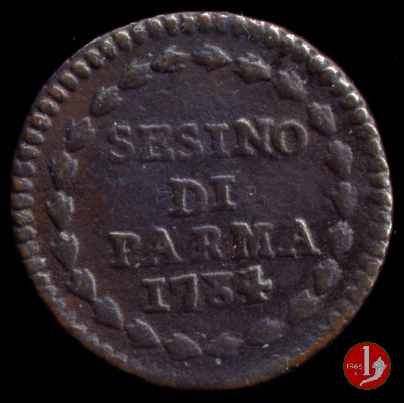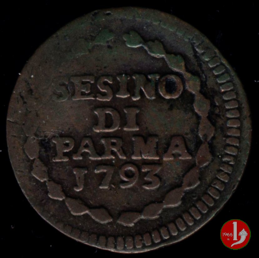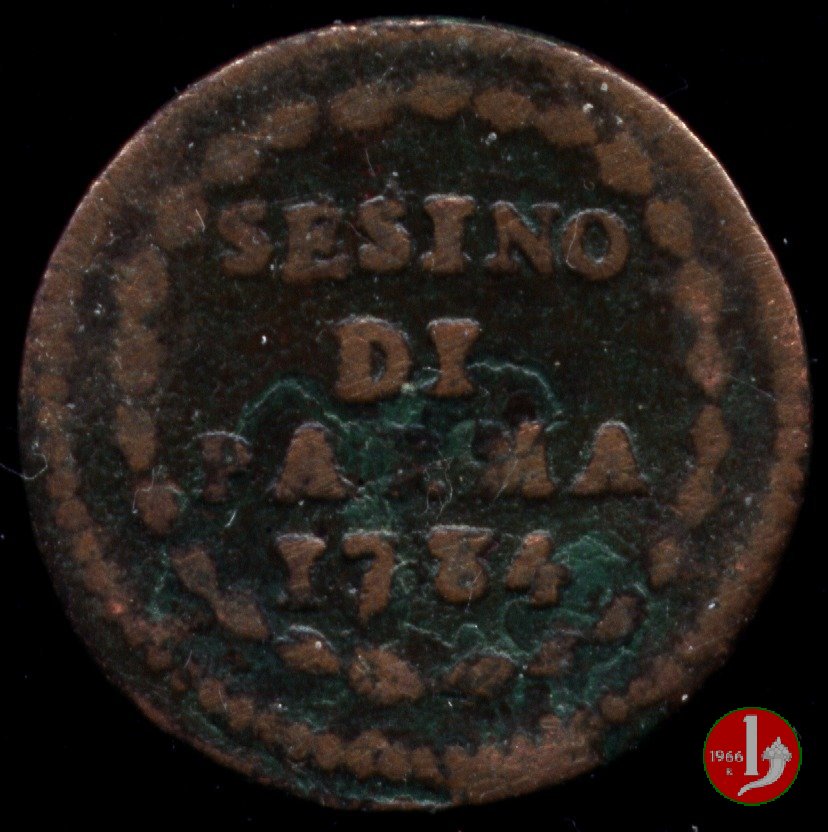 Cod. W-FERD/0-0:9381 B. 1783B, CNI assente: D\ FERD • I • D • G • H • I • PA • PLA • ET V • DUX •, stemma coronato entro cerchio di grani. R\ ![]() // SESINO // DI // PARMA // 1783 // ![]() entro corona d'alloro.