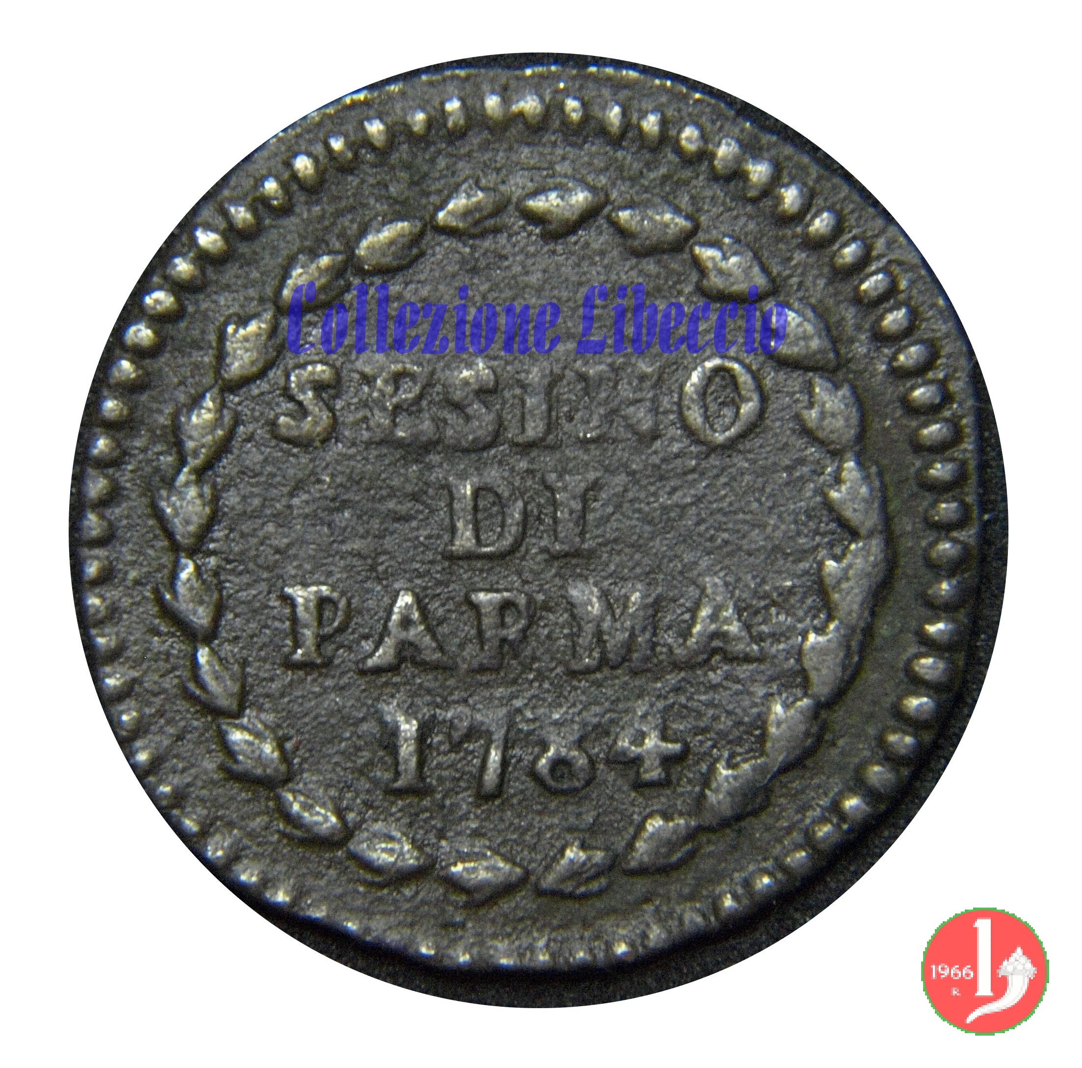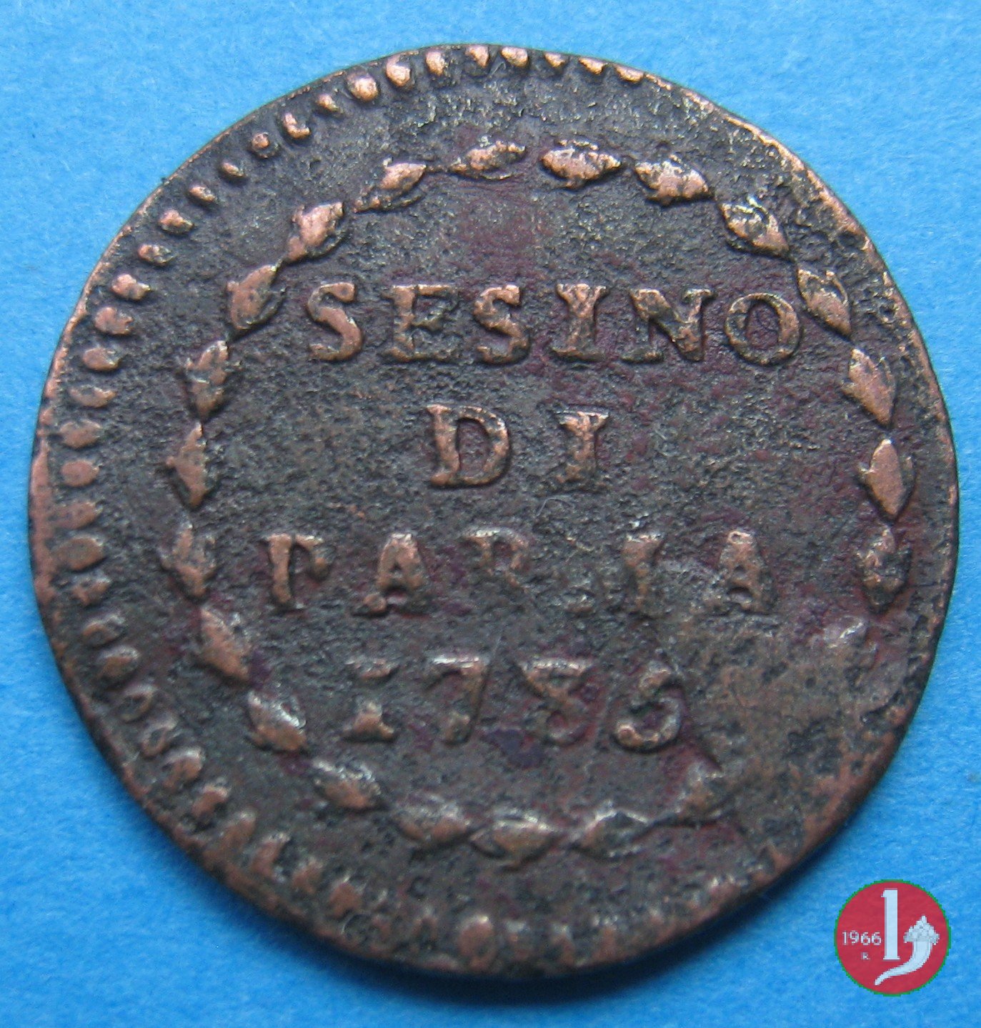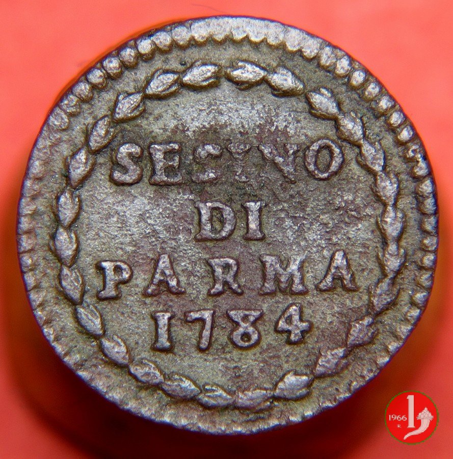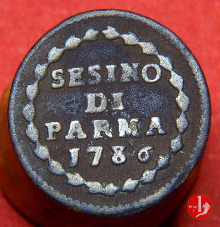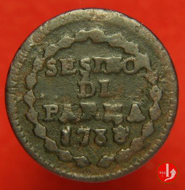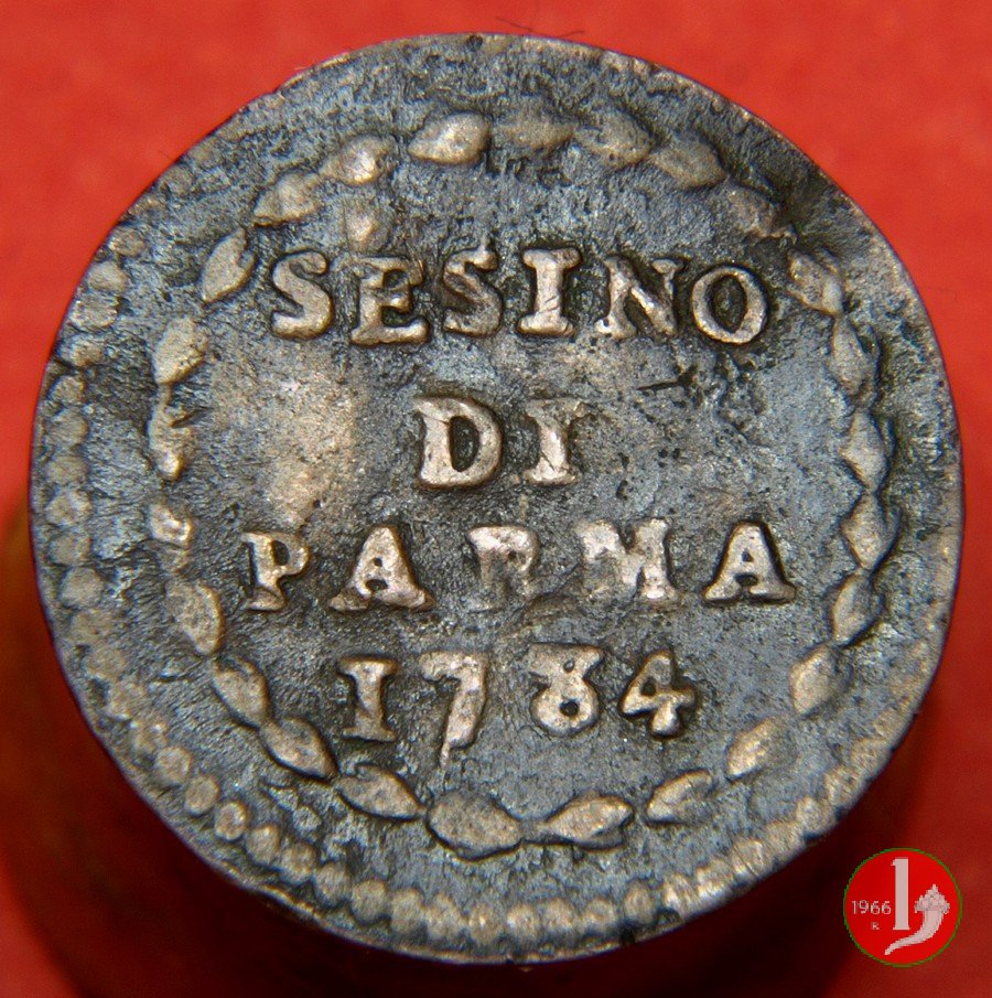 Cod. W-FERD/0-0:9381 B. 1783B, CNI assente: D\ FERD • I • D • G • H • I • PA • PLA • ET V • DUX •, stemma coronato entro cerchio di grani. R\ ![]() // SESINO // DI // PARMA // 1783 // ![]() entro corona d'alloro.
