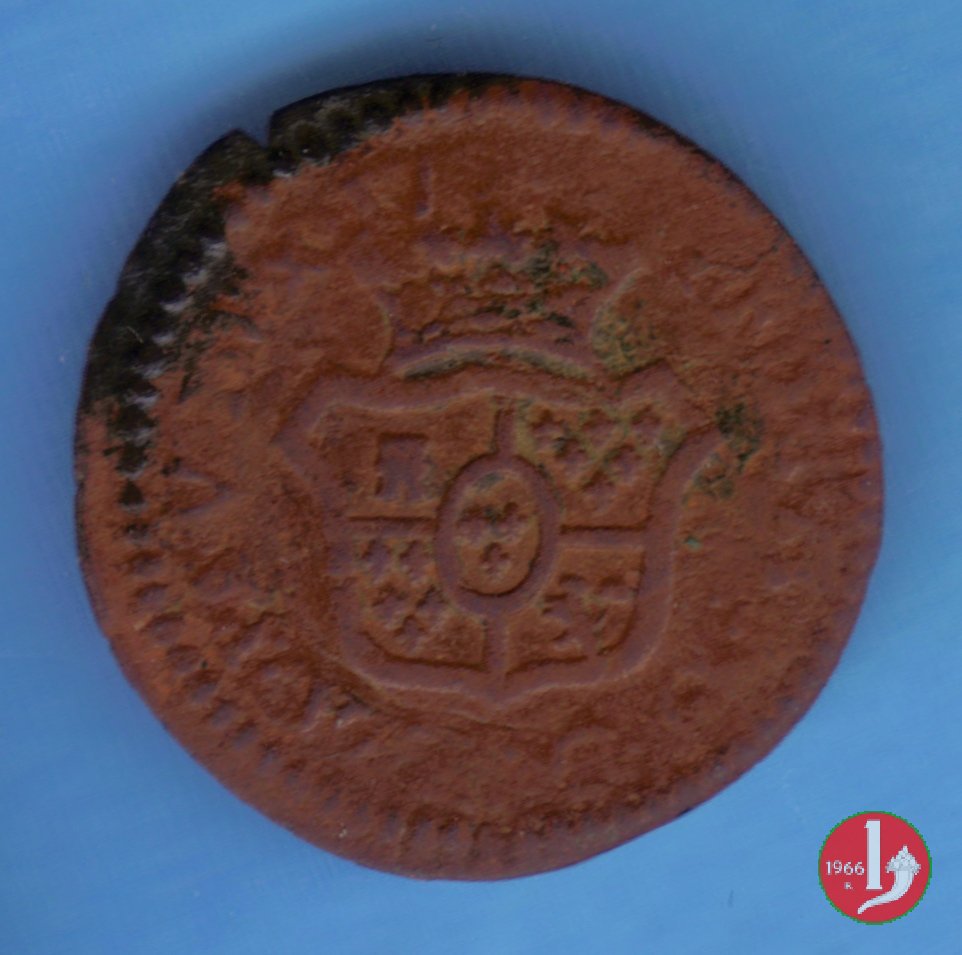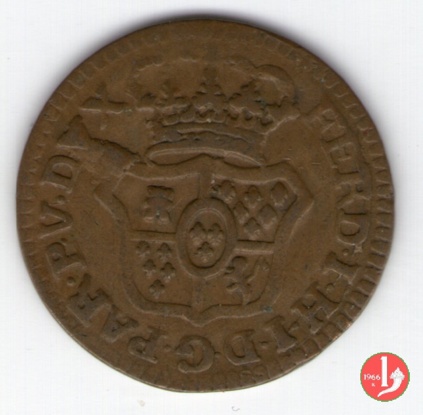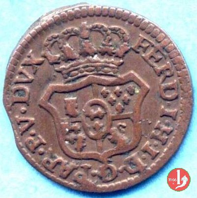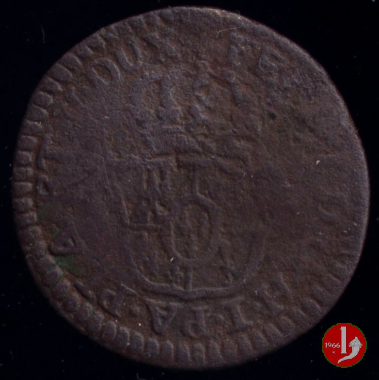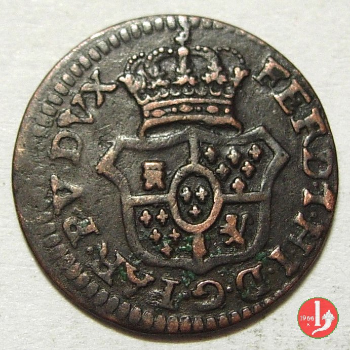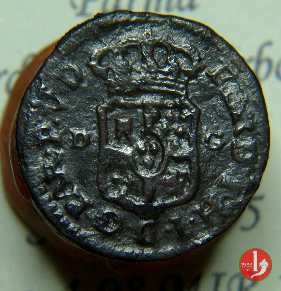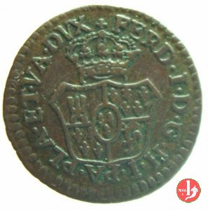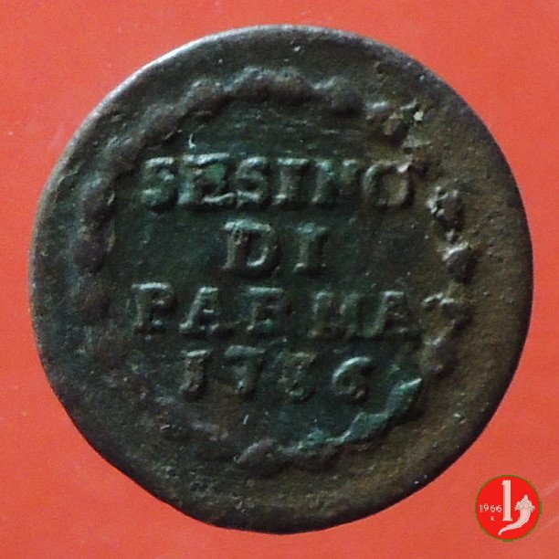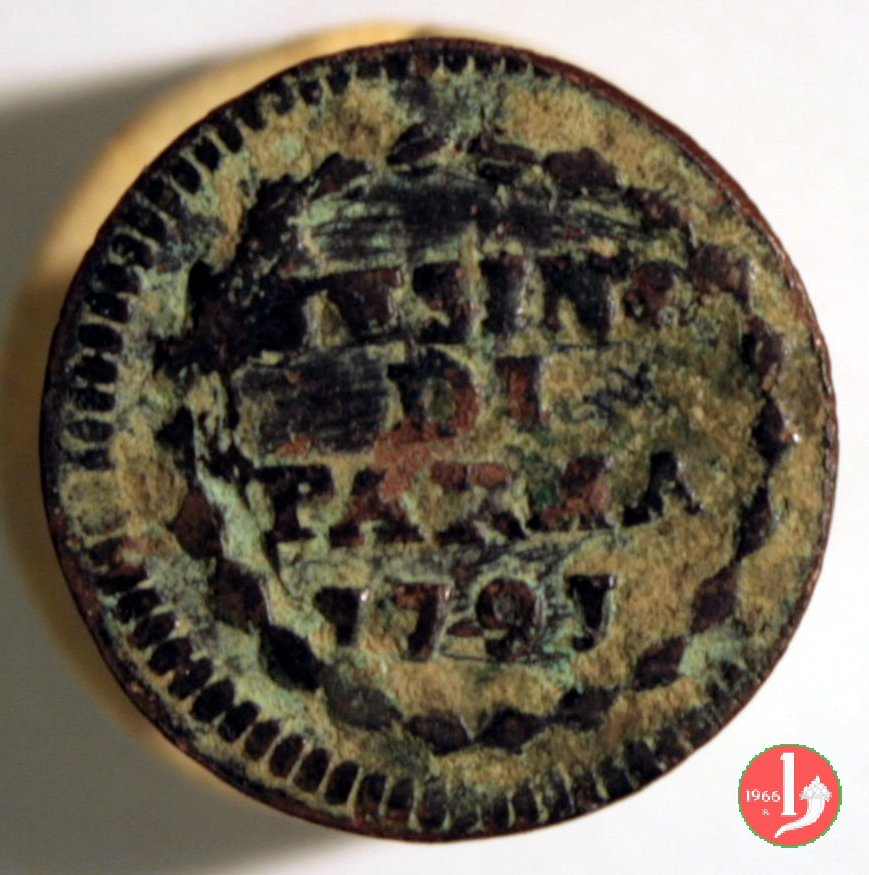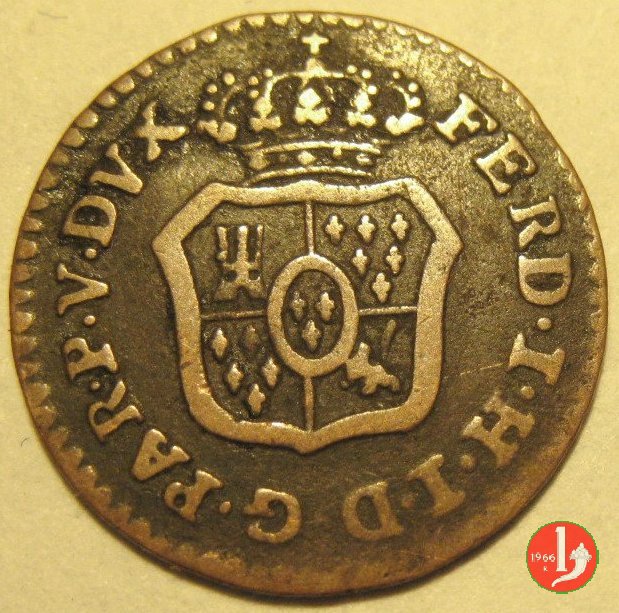 | Cod. W-FERD/0-3:11670 B. assente, CNI assente: D\ FERD • I • H • I • D • G • PAR • PLAC • VA • DVX •, stemma coronato simile a quello del CNI 80 ma che non interrompe la legenda entro cerchio di grani. R\ SESINO // DI // PARMA // 1786 entro corona d'alloro in un cerchio di grani. | ||||||||||