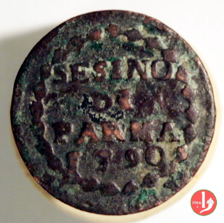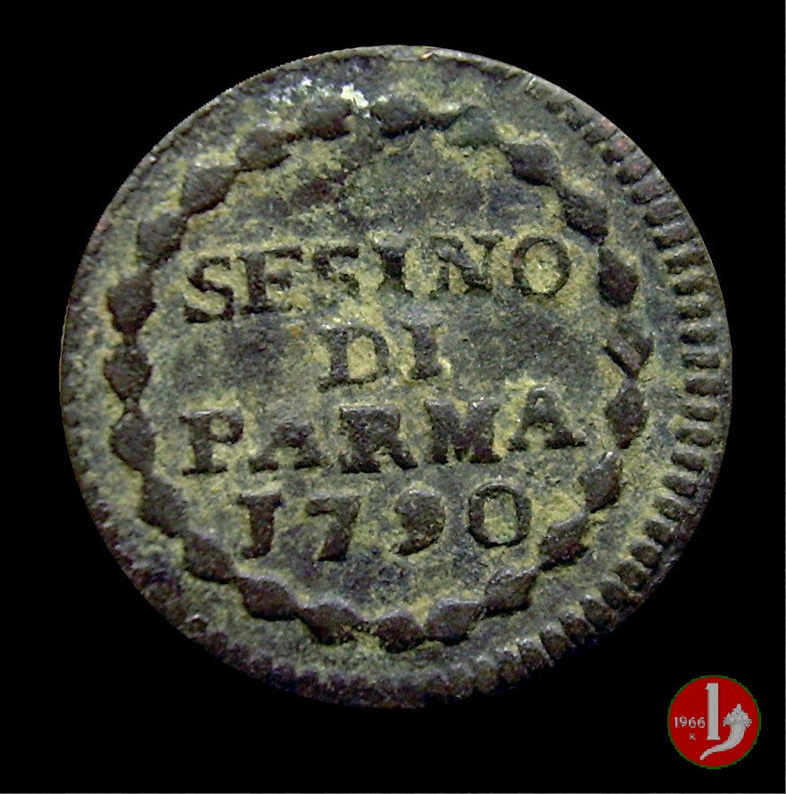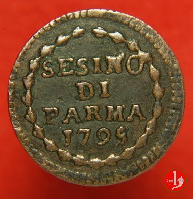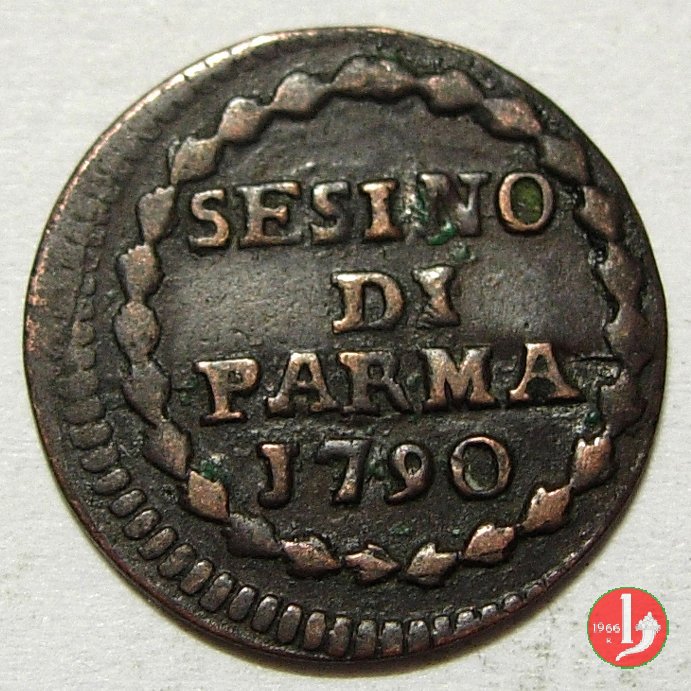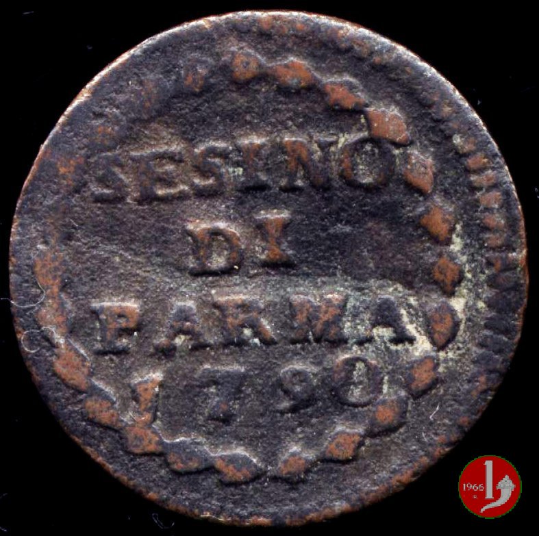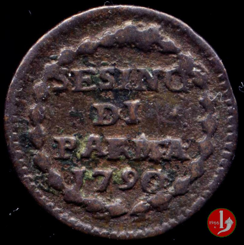 | Cod. W-FERD/0-7:9395 B. 1790, CNI 108: D\ FERD • I • H • I • D • G • PAR • P • V • DVX •, stemma coronato la cui corona interrompe la legenda entro cerchio di grani. R\ SESINO // DI // PARMA // J790 entro corona d'alloro in un cerchio di grani. | ||||||||||