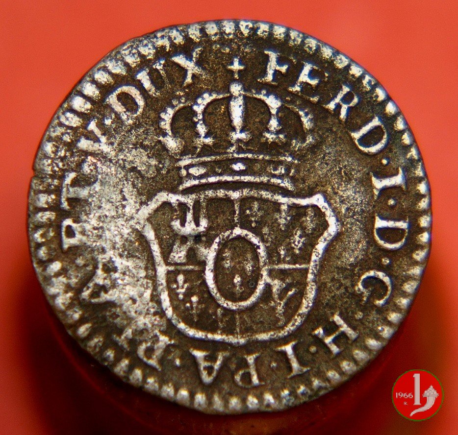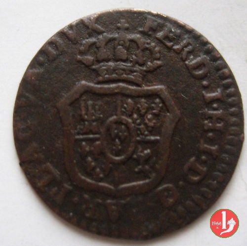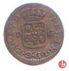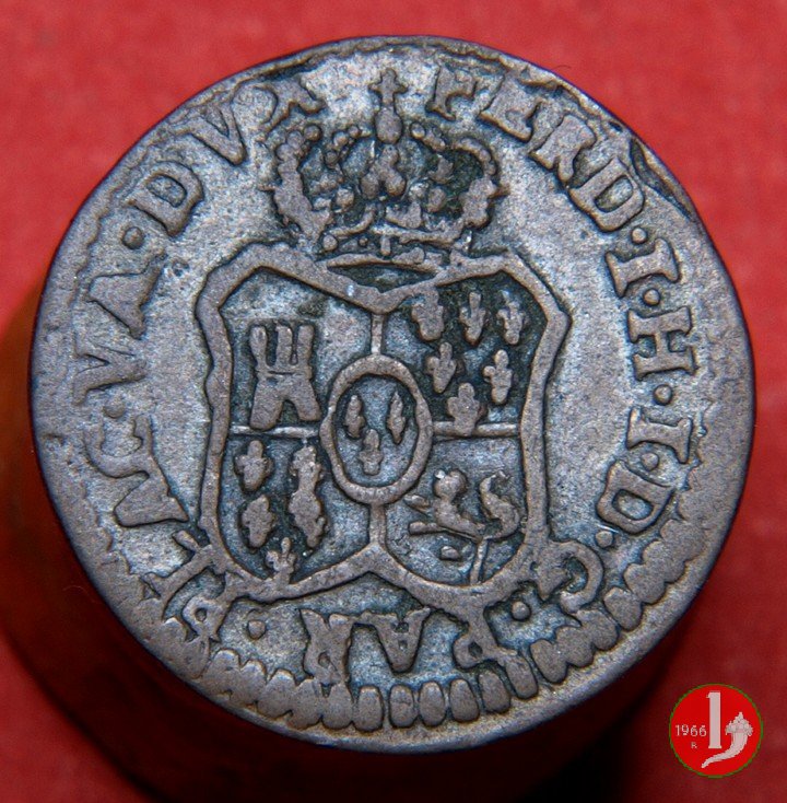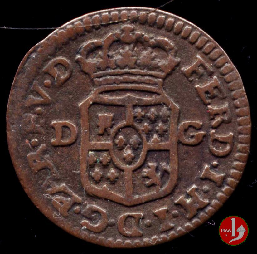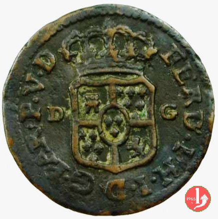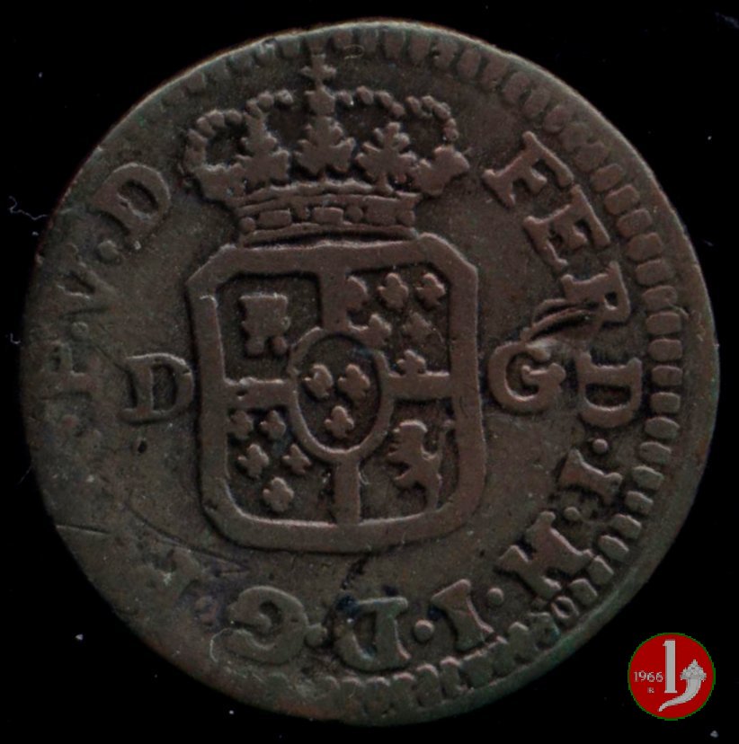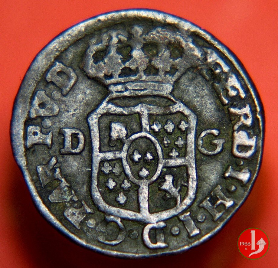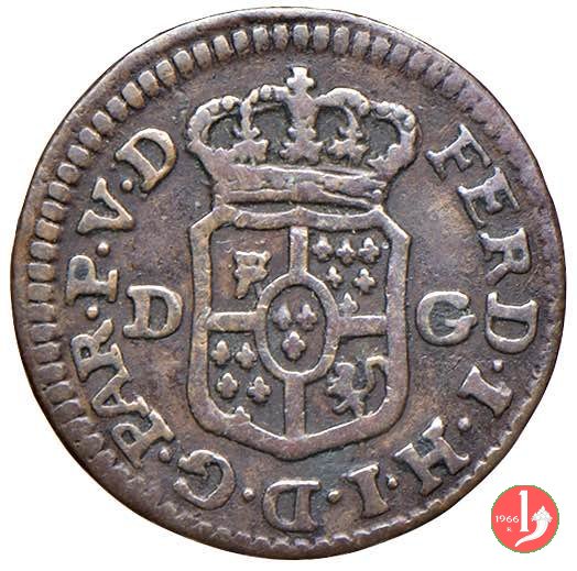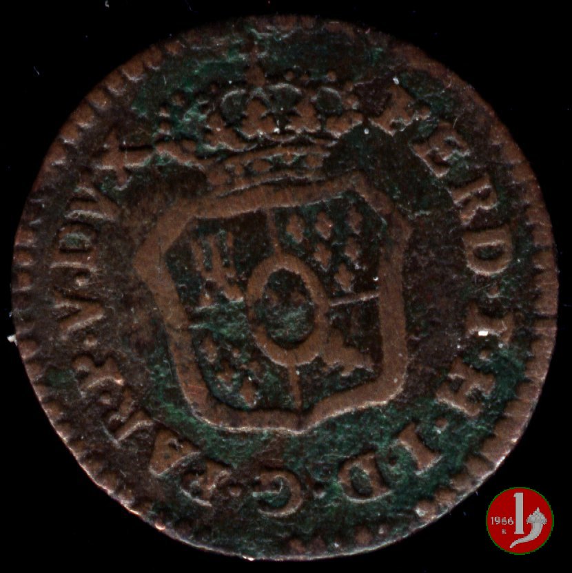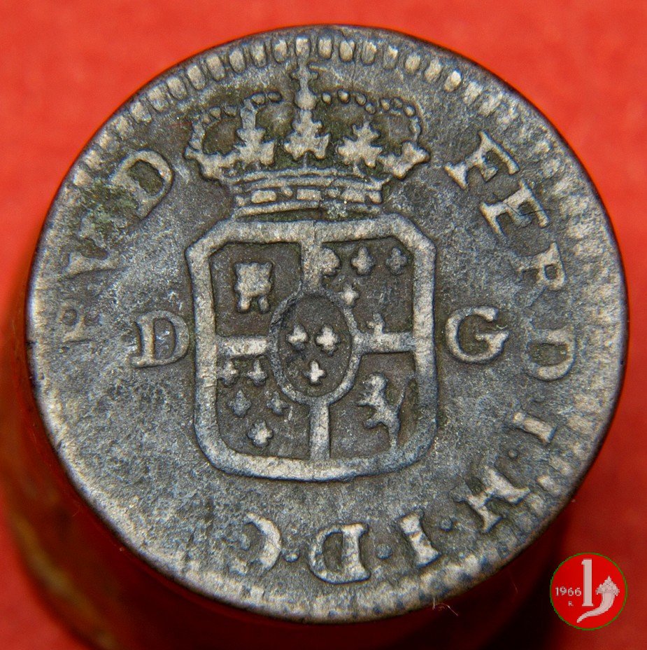 | Cod. W-FERD/0-18:16243 B. assente, CNI assente: D FERD • I • H • I • D • G • PAR • P • V • D, stemma coronato di forma rettangolare con punta in basso la cui corona interrompe la legenda e ai cui lati si trovano le lettere D e G (piccole) entro cerchio di grani. R versione in incuso del D a causa di "brockage" Nonostante l'assenza della data si identifica come esemplare battuto usando conii visti solo per il millesimo 1795. | ||||||||||