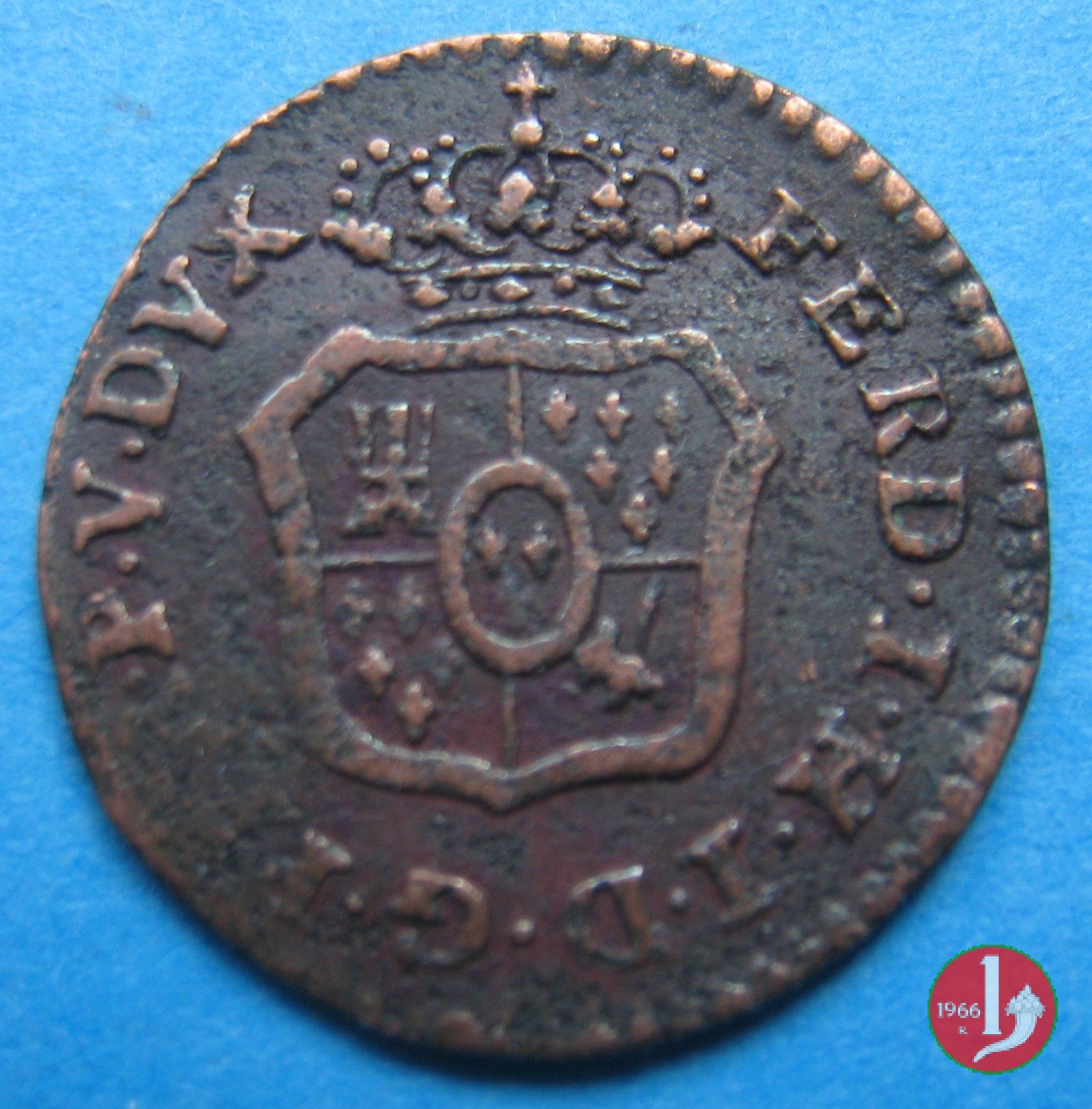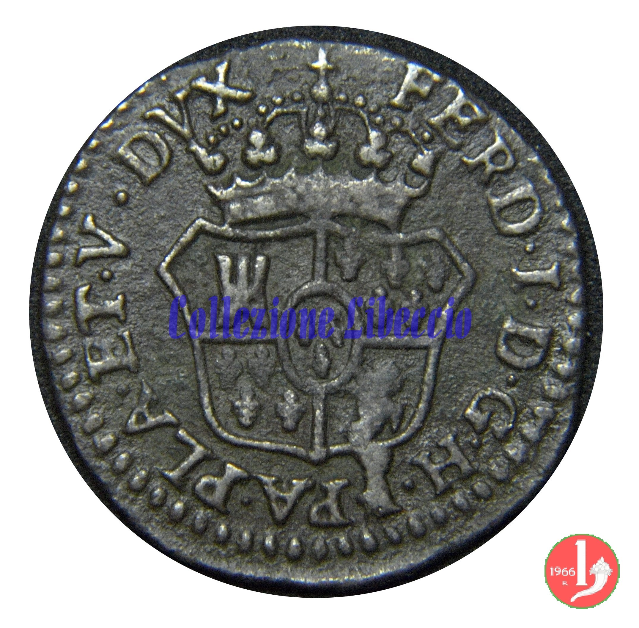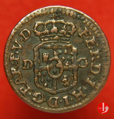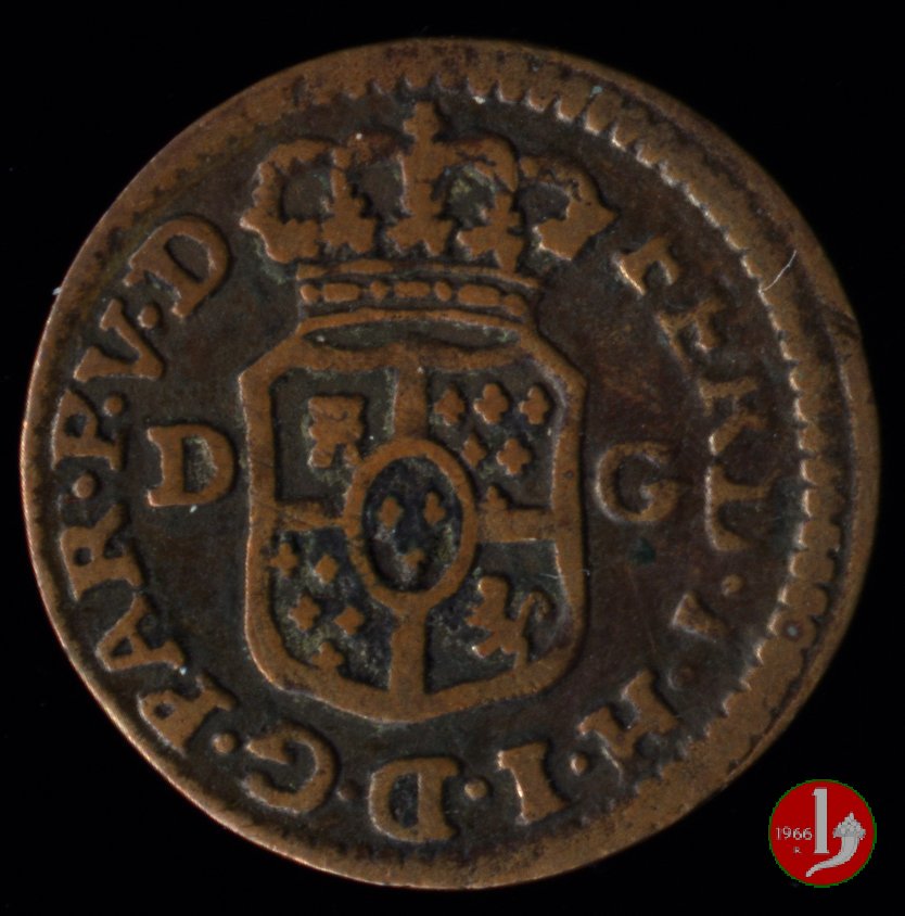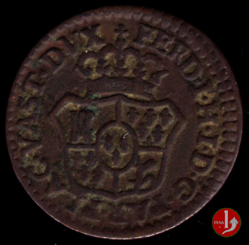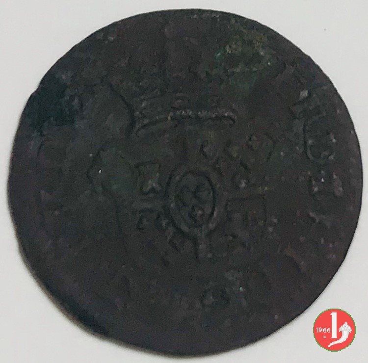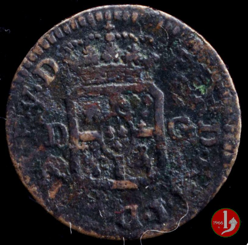 | Cod. W-FERD/0-18:16243 B. assente, CNI assente: D FERD • I • H • I • D • G • PAR • P • V • D, stemma coronato di forma rettangolare con punta in basso la cui corona interrompe la legenda e ai cui lati si trovano le lettere D e G (piccole) entro cerchio di grani. R versione in incuso del D a causa di "brockage" Nonostante l'assenza della data si identifica come esemplare battuto usando conii visti solo per il millesimo 1795. | ||||||||||