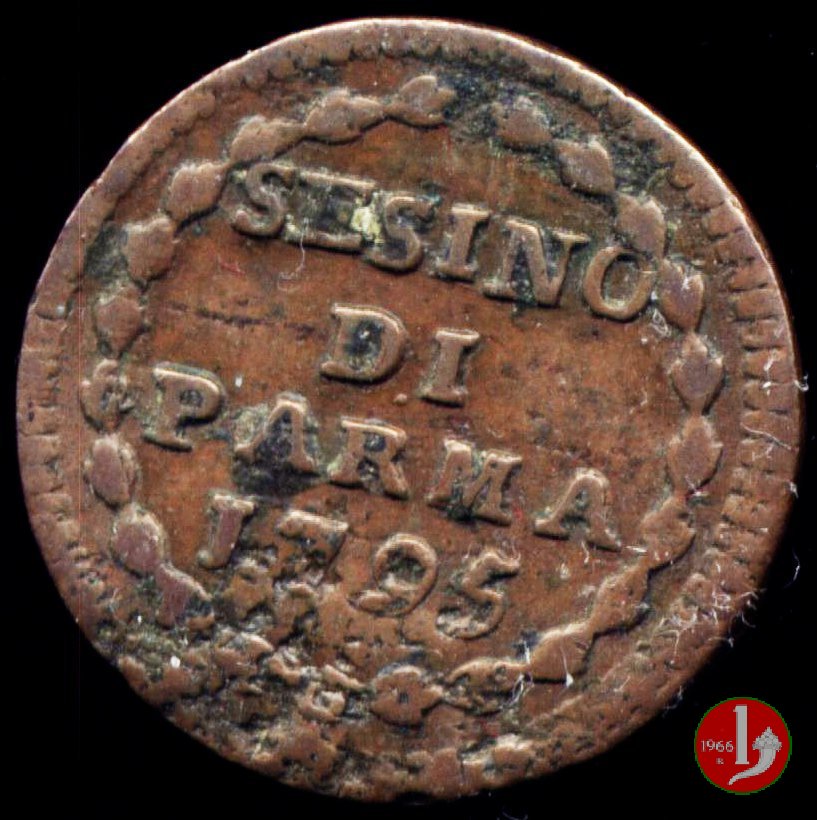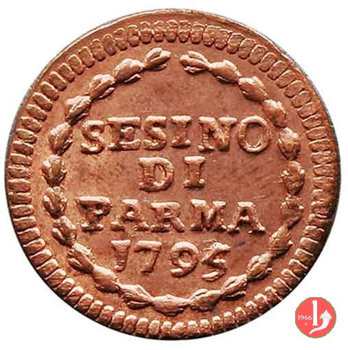 | Cod. W-FERD/0-13:9400 B. 1795, CNI 146: D FERD • I • H • I • D • G • PAR • P • V • D, stemma coronato di forma rettangolare con punta in basso la cui corona interrompe la legenda e ai cui lati si trovano le lettere D e G (grandi) entro cerchio di grani. R SESINO // DI // PARMA // J795 entro corona d'alloro in un cerchio di grani. | ||||||||||