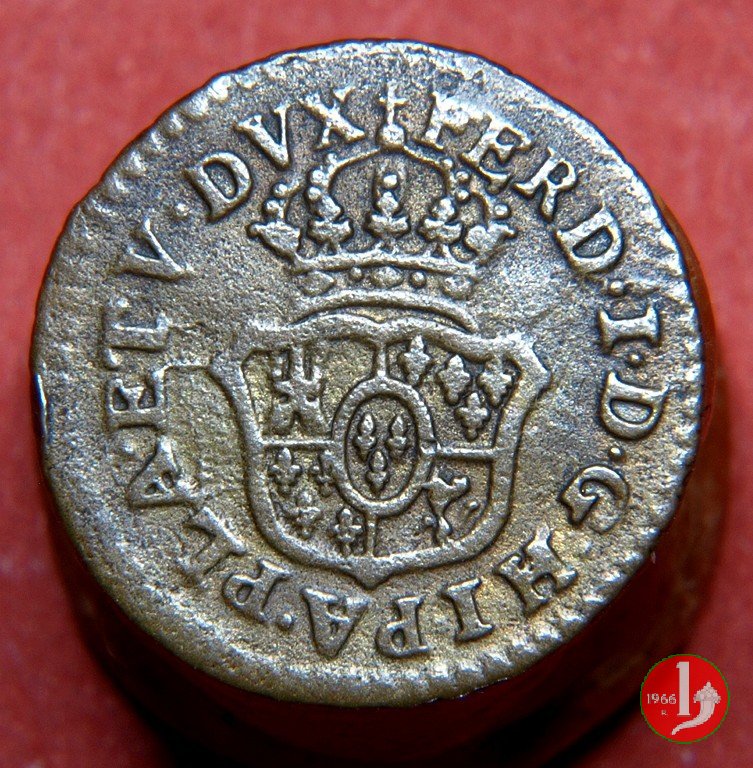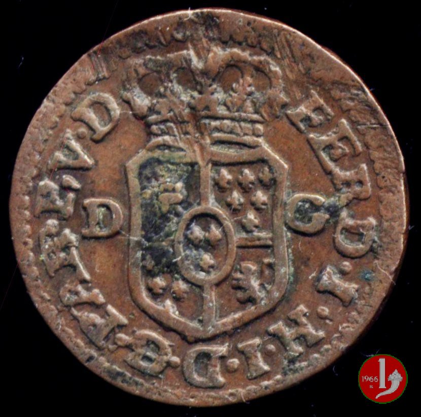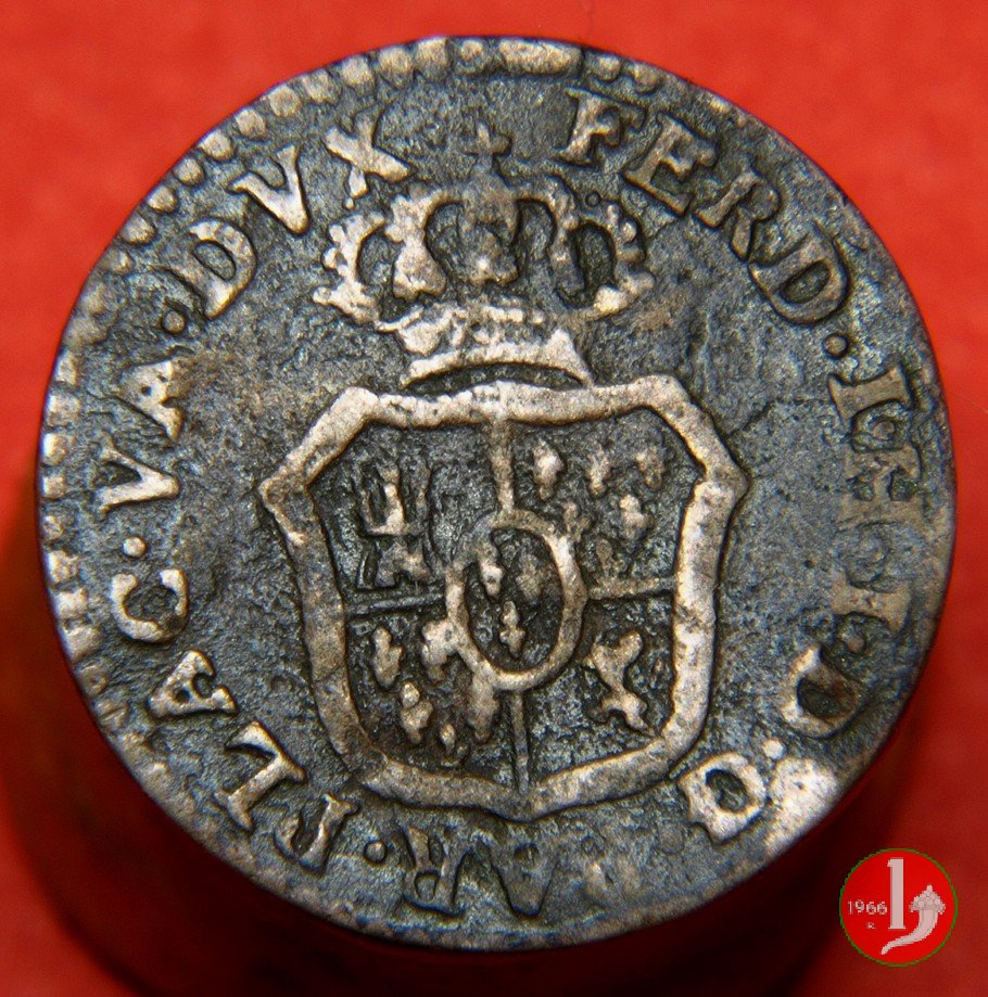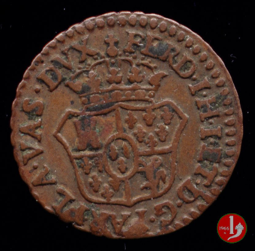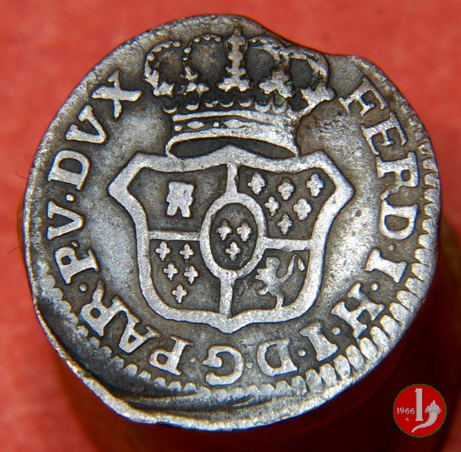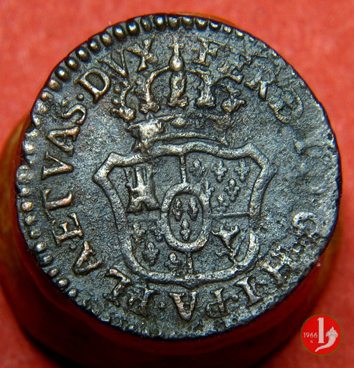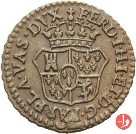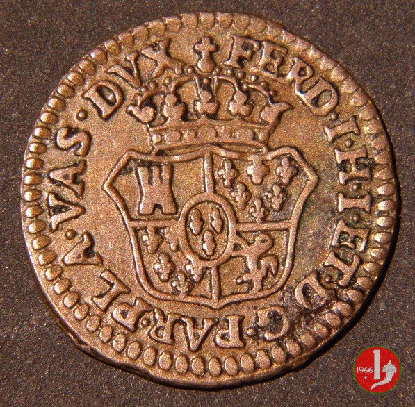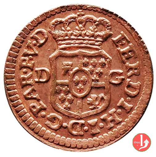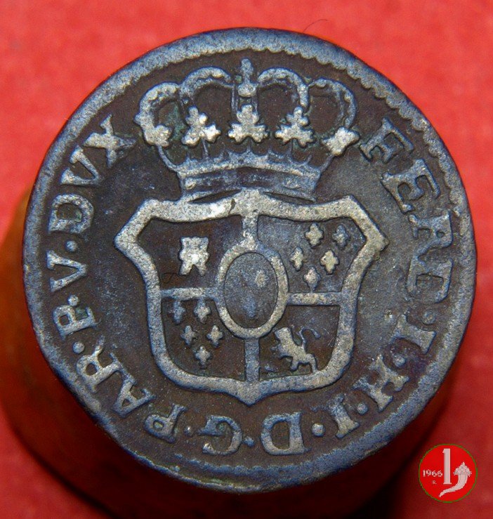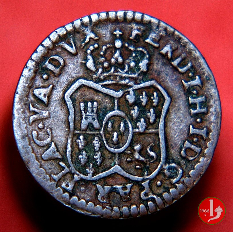 | Cod. W-FERD/0-2:2780 B. 1785, CNI 62: D FERD • I • H • I • D • G • PAR • P • V • DVX •, stemma coronato simile al precedente con corona che interrompe competamente la legenda entro cerchio di grani. R SESINO // DI // PARMA // 1785 • entro corona d'alloro in un cerchio di grani. Estremamente raro, si conoscono gli esemplari della Collezione Reale, del Medagliere di Parma e tre in collezione privata. | ||||||||||