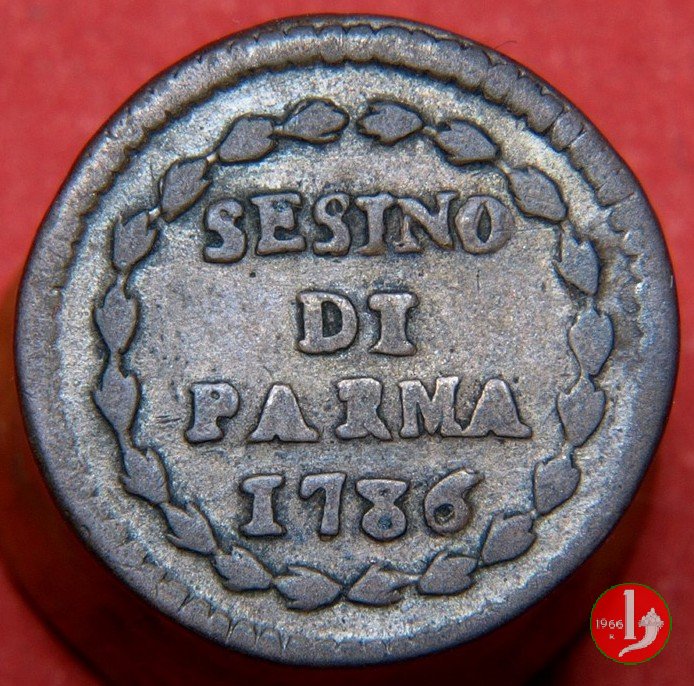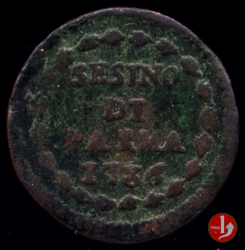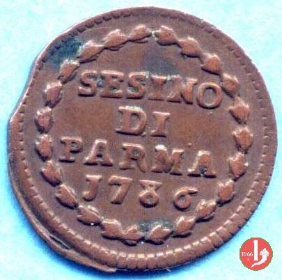 | Cod. W-FERD/0-3:9392 B. 1786B, CNI 79: D\ FERD • I • H • I • D • G • PAR • PLAC • VA • DVX •, stemma coronato di forma singolarmente squadrata con corona che praticamente non interrompe la legenda entro cerchio di grani. R\ SESINO // DI // PARMA // 1786 entro corona d'alloro in un cerchio di grani. | ||||||||||