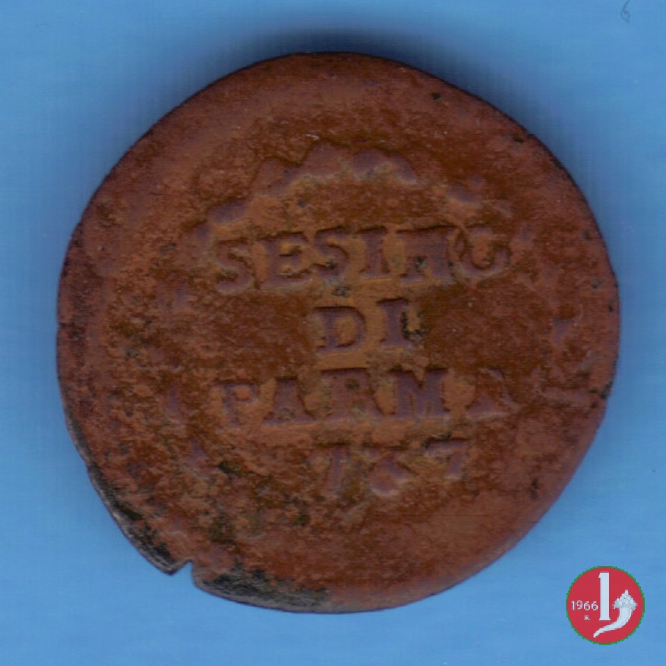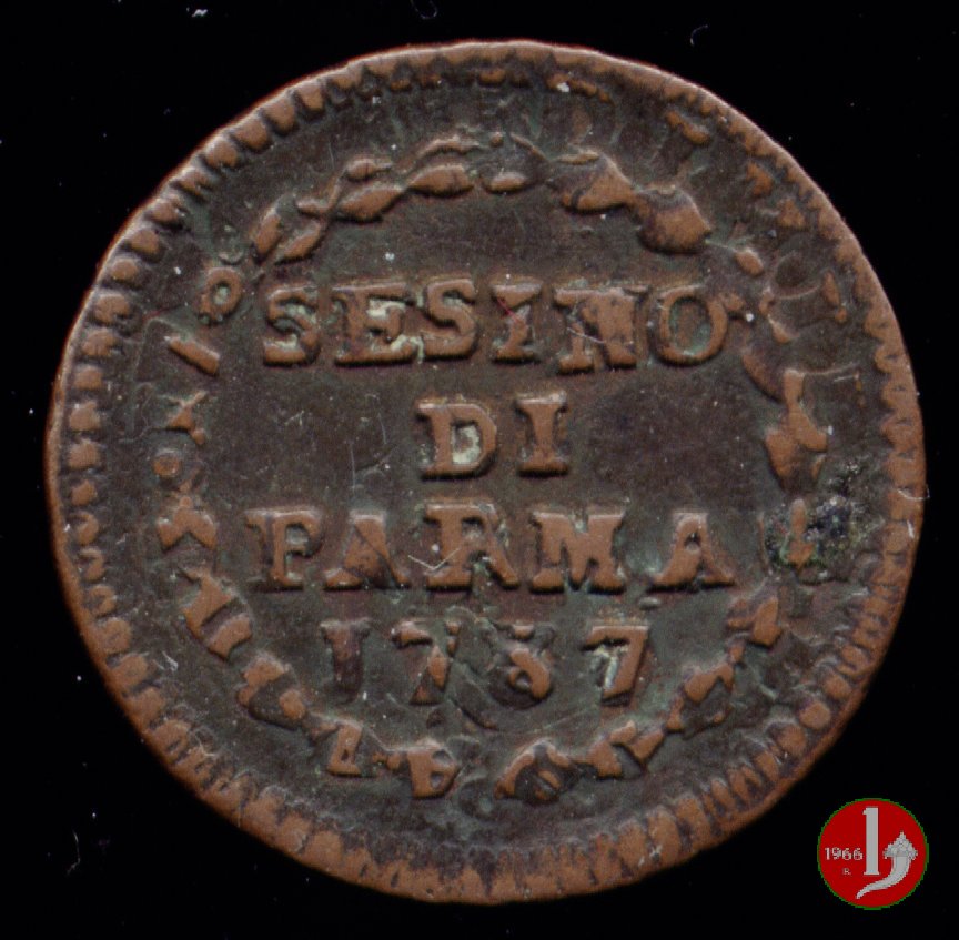 | Cod. W-FERD/0-4:9393 B. 1787, CNI 88: D\ FERD • I • H • I • D • G • PAR • P • V • DVX •, stemma coronato la cui corona interrompe la legenda entro cerchio di grani. R\ SESINO // DI // PARMA // J787 entro corona d'alloro in un cerchio di grani. | ||||||||||