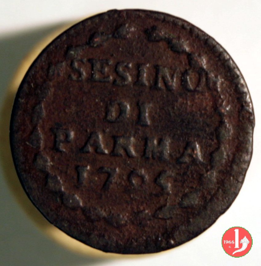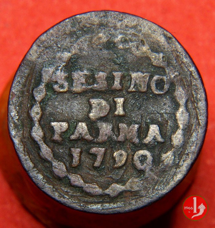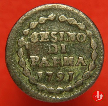 | Cod. W-FERD/0-8:9396 B. 1791, CNI 115: D\ FERD • I • H • I • D • G • PAR • P • V • DVX •, stemma coronato la cui corona interrompe la legenda entro cerchio di grani. R\ SESINO // DI // PARMA // J791 entro corona d'alloro in un cerchio di grani. | ||||||||||