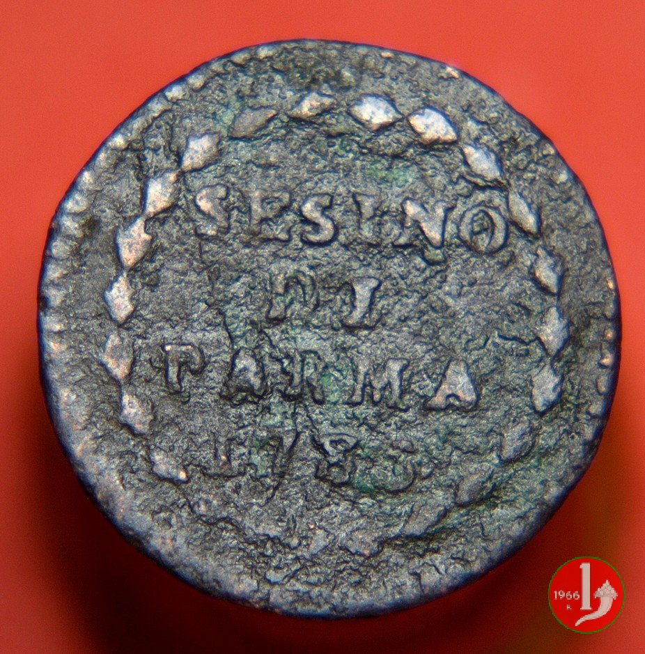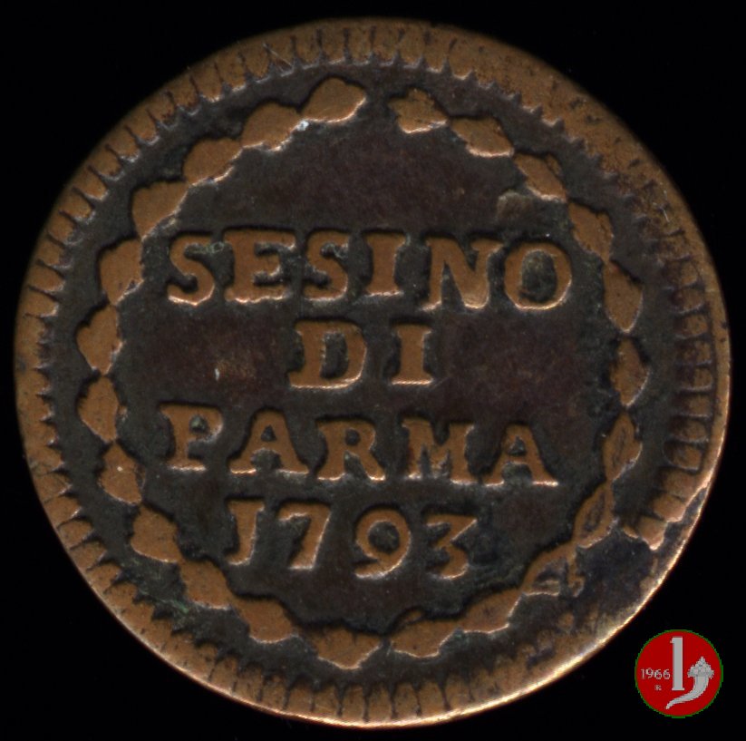 Cod. W-FERD/0-0:9382 B. 1783C, CNI 8: D\ FERD • I • D • G • H • I • PA • PLA • ET VA • DUX •, stemma coronato entro cerchio di grani. R\ ![]() // SESINO // DI // PARMA // 1783 entro cerchio di grani ma senza corona d'alloro.