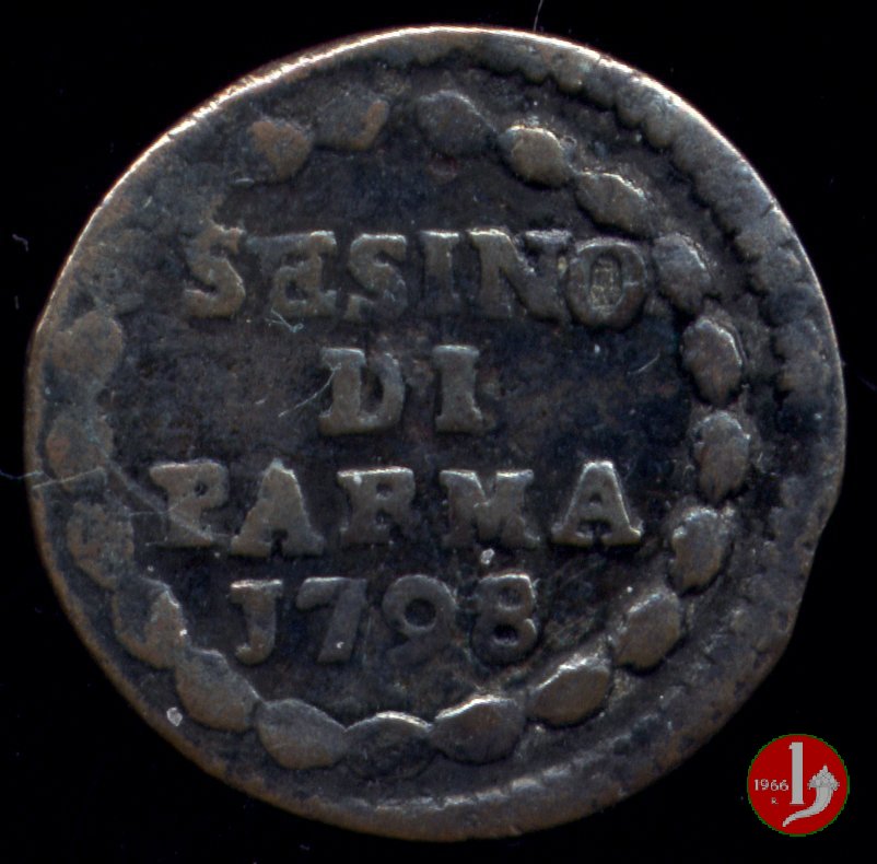 | Cod. W-FERD/0-16:9401 B. 1798B, CNI 164: D\ FERD • I • H • I • D • G • PAR • P • V • D, stemma coronato di forma rettangolare con punta in basso la cui corona interrompe la legenda e ai cui lati si trovano le lettere D e G (grandi) entro cerchio di grani. R\ SESINO // DI // PARMA // J798 entro corona d'alloro in un cerchio di grani. | ||||||||||