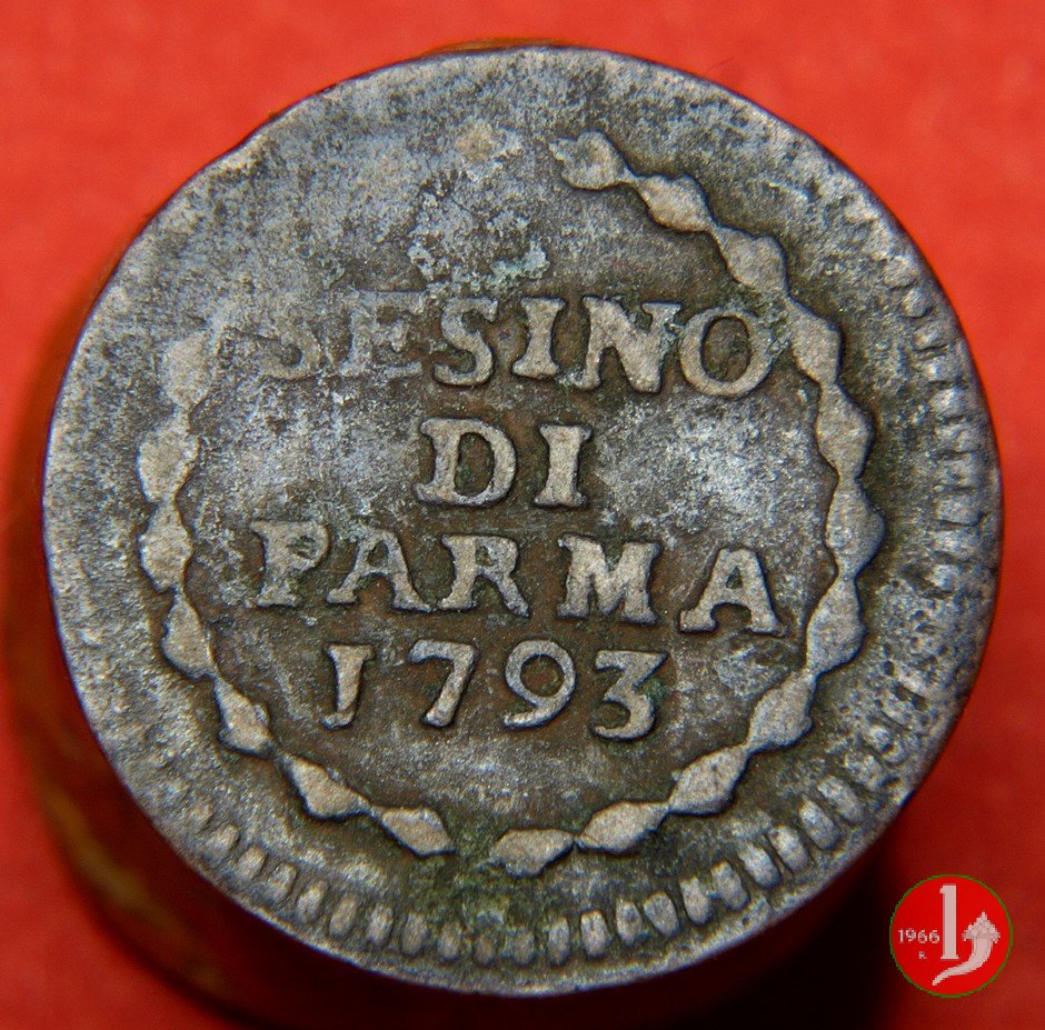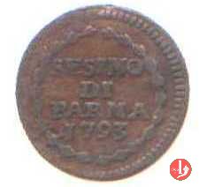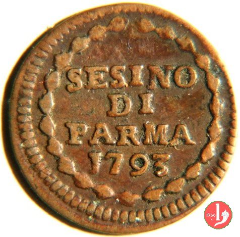 | Cod. W-FERD/0-11:9399 B. 1793B, CNI 134: D\ FERD • I • H • I • D • G • PAR • P • V • D, stemma coronato di forma rettangolare senza punta in basso la cui corona interrompe la legenda e ai cui lati si trovano le lettere D e G entro cerchio di grani. R\ SESINO // DI // PARMA // J793 entro corona d'alloro in un cerchio di grani. | ||||||||||
