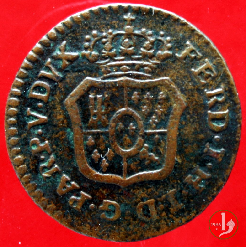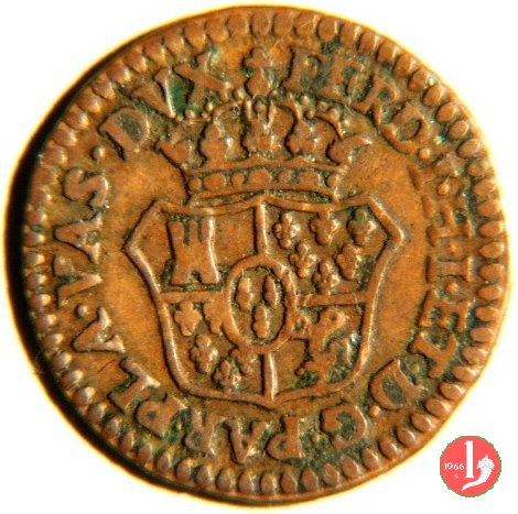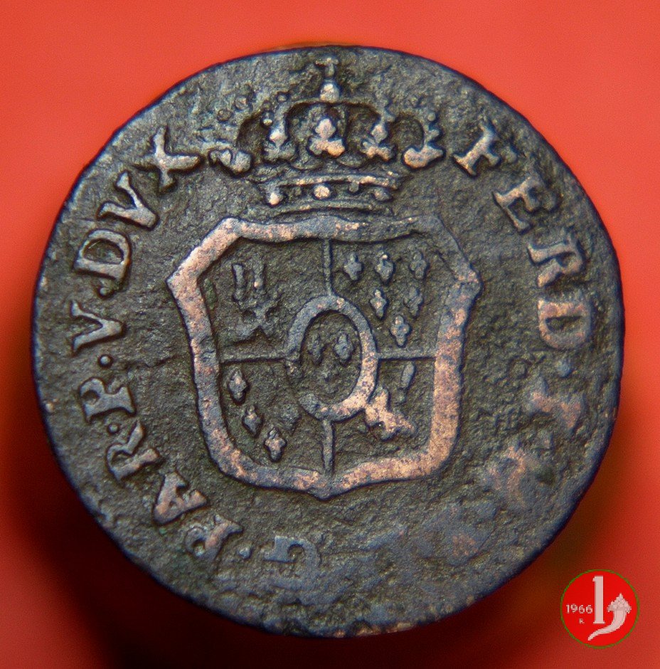 | Cod. W-FERD/0-11:9398 B. 1793A, CNI 134: D\ FERD • I • H • I • D • G • PAR • P • V • D, stemma coronato di forma rettangolare a punta in basso la cui corona interrompe la legenda e ai cui lati si trovano le lettere D e G entro cerchio di grani. R\ SESINO // DI // PARMA // J793 entro corona d'alloro in un cerchio di grani. | ||||||||||