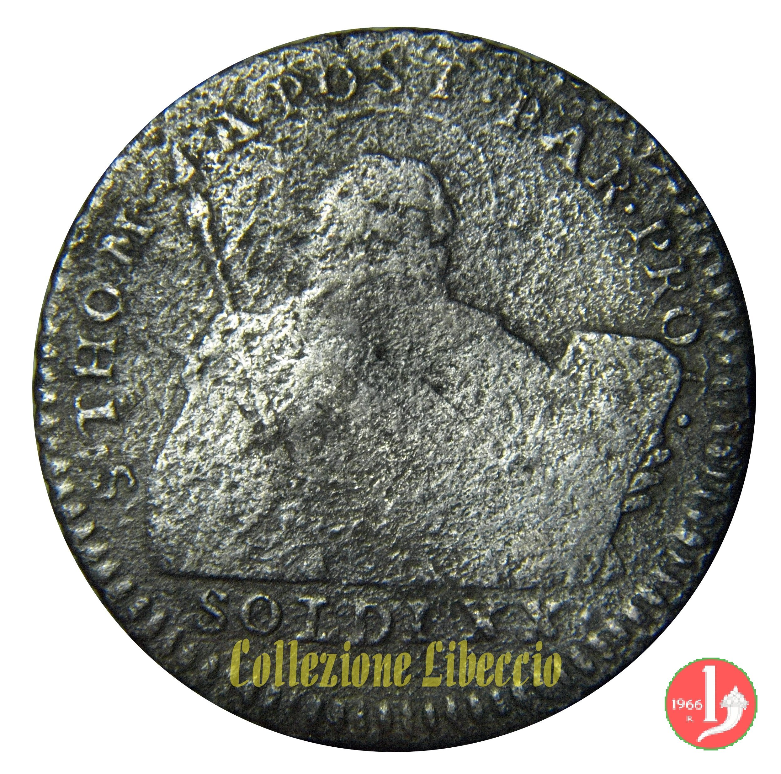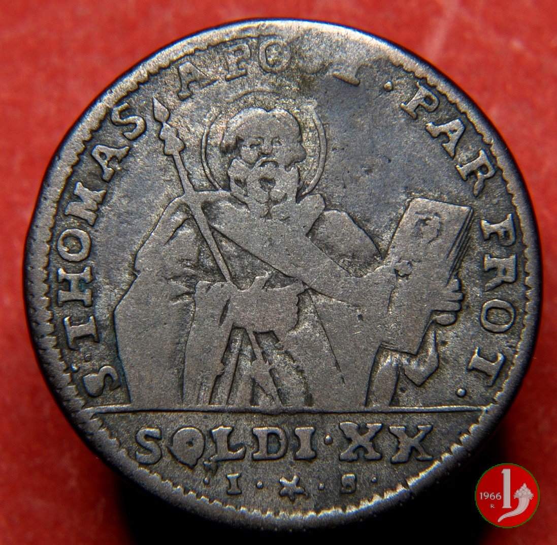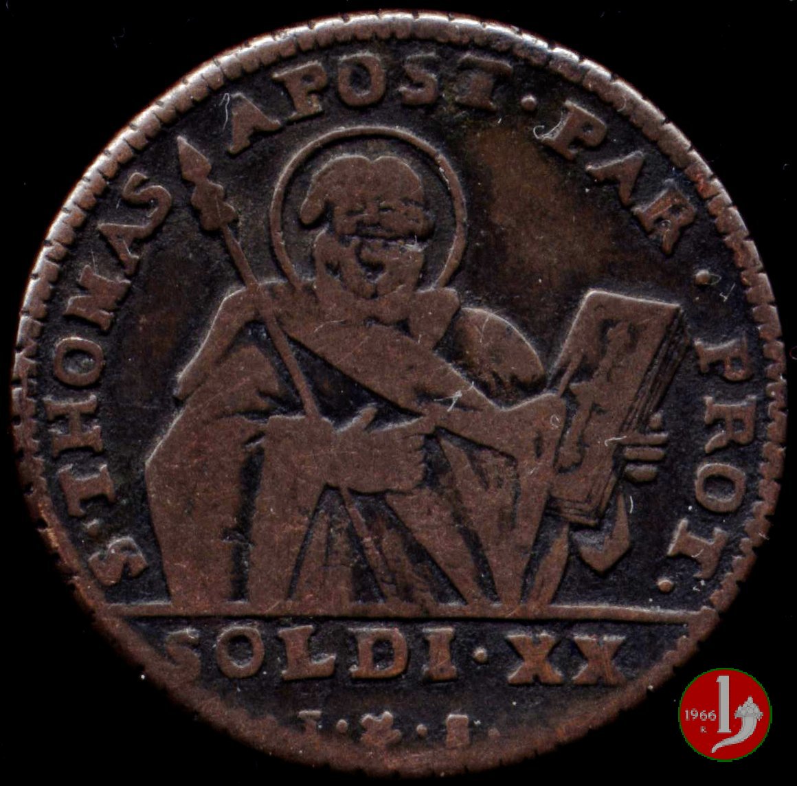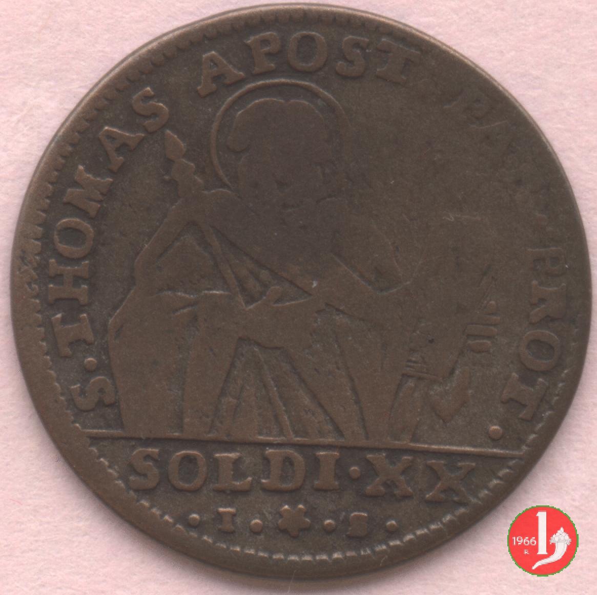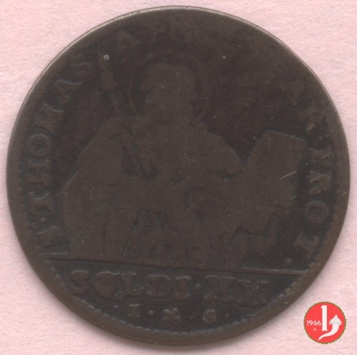 Stemma del casato Borbone-Parma tra rami di palma e le lettere D • G •: FERD •(inandus) I • H •(ispaniarum) I •(nfans) D •(ei) G •(ratia) PAR •(mae) PL •(acentiae et) VAST •(allae) DUX e il milelsimo.1  Busto di S. Tommaso: S • THOMAS • APOST • PAR • PROT • Nell'esergo: SOLDI XX e, dal 1786, indicazione dello zecchiere (lettere I e S con in mezzo una stella a cinque punte per Giuseppe Siliprandi).