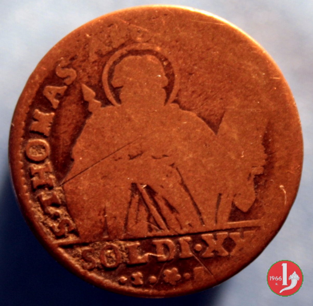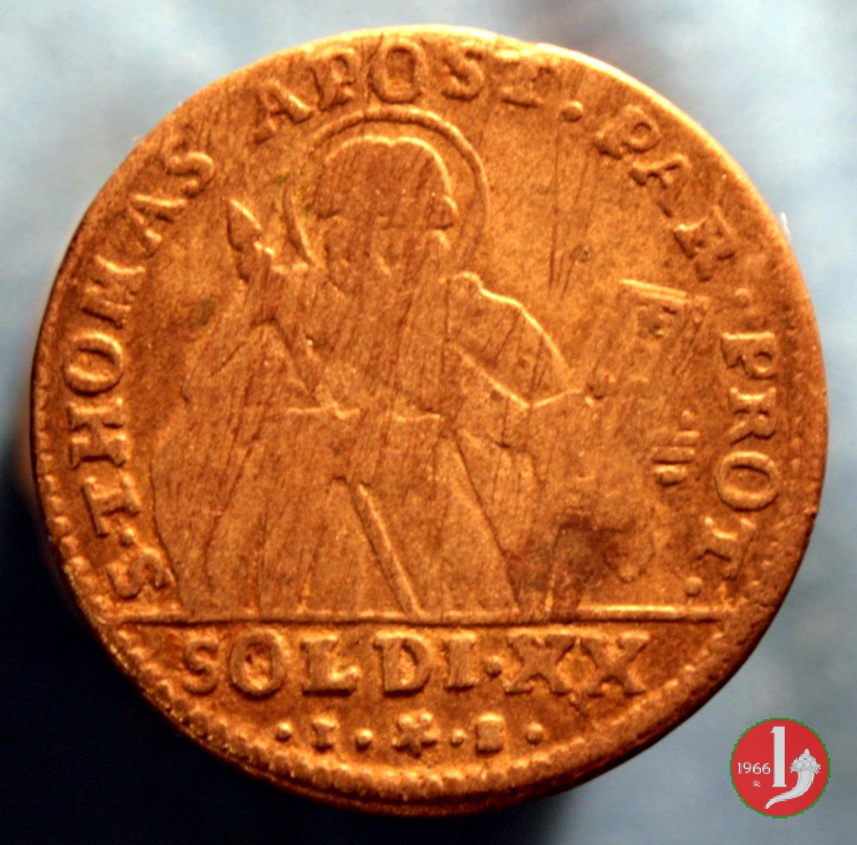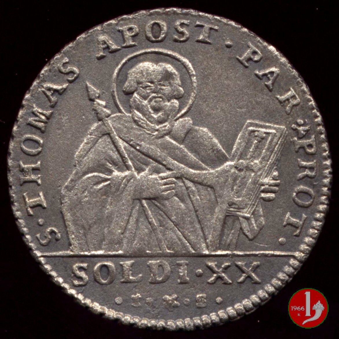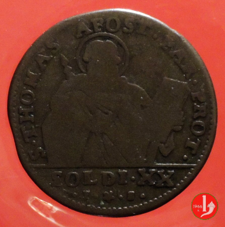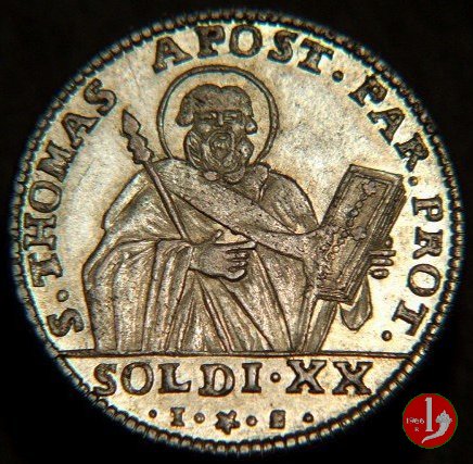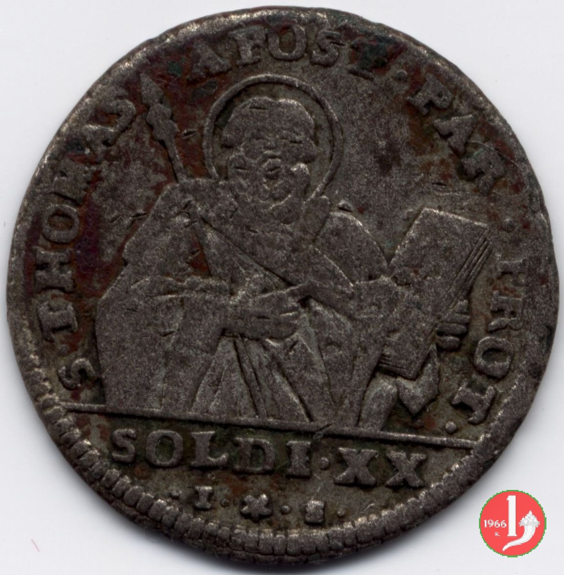 Stemma del casato Borbone-Parma tra rami di palma e le lettere D • G •: FERD •(inandus) I • H •(ispaniarum) I •(nfans) D •(ei) G •(ratia) PAR •(mae) PL •(acentiae et) VAST •(allae) DUX e il milelsimo.1  Busto di S. Tommaso: S • THOMAS • APOST • PAR • PROT • Nell'esergo: SOLDI XX e, dal 1786, indicazione dello zecchiere (lettere I e S con in mezzo una stella a cinque punte per Giuseppe Siliprandi).