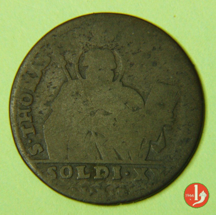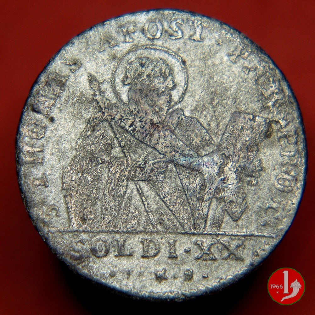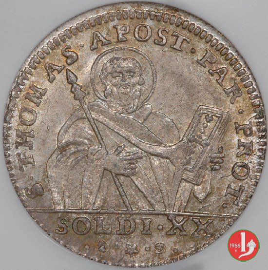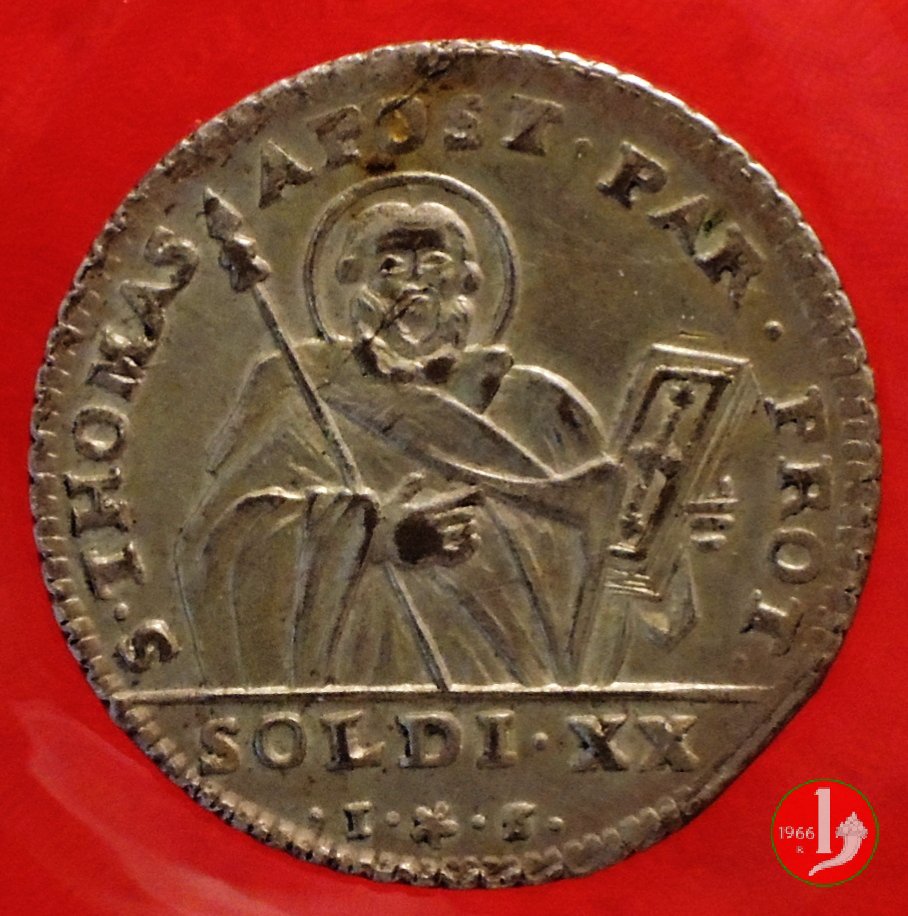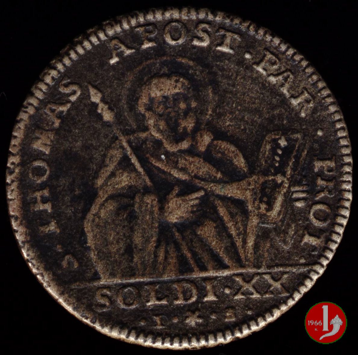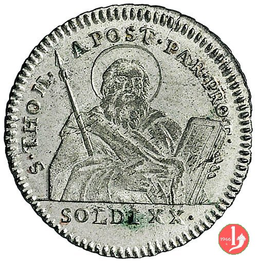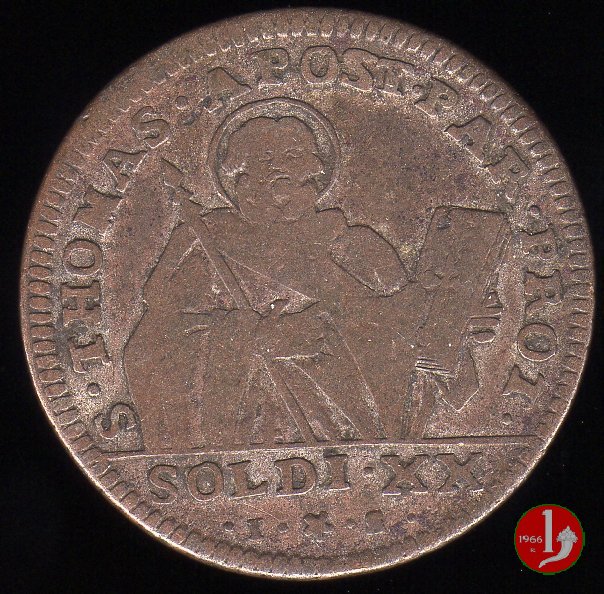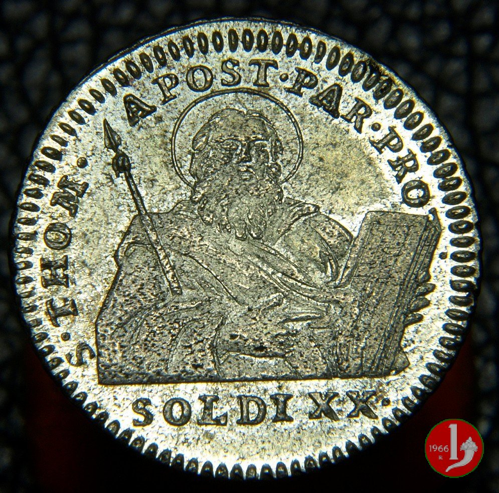 Stemma del casato Borbone-Parma tra rami di palma e le lettere D • G •: FERD •(inandus) I • H •(ispaniarum) I •(nfans) D •(ei) G •(ratia) PAR •(mae) PL •(acentiae et) VAST •(allae) DUX e il milelsimo.1  Busto di S. Tommaso: S • THOMAS • APOST • PAR • PROT • Nell'esergo: SOLDI XX e, dal 1786, indicazione dello zecchiere (lettere I e S con in mezzo una stella a cinque punte per Giuseppe Siliprandi).
