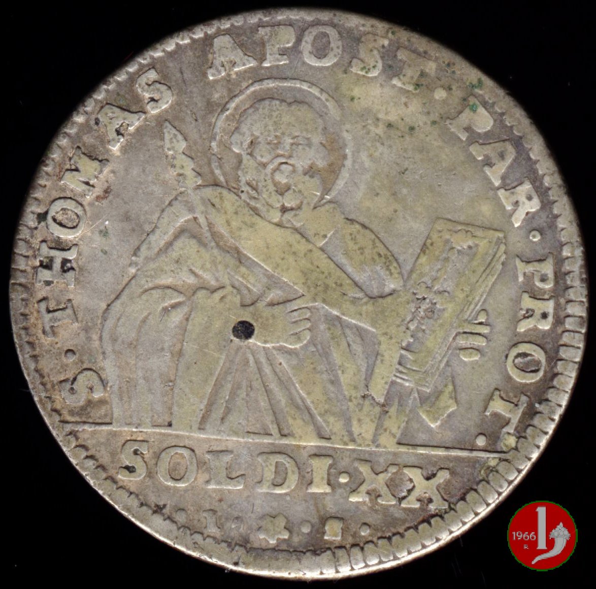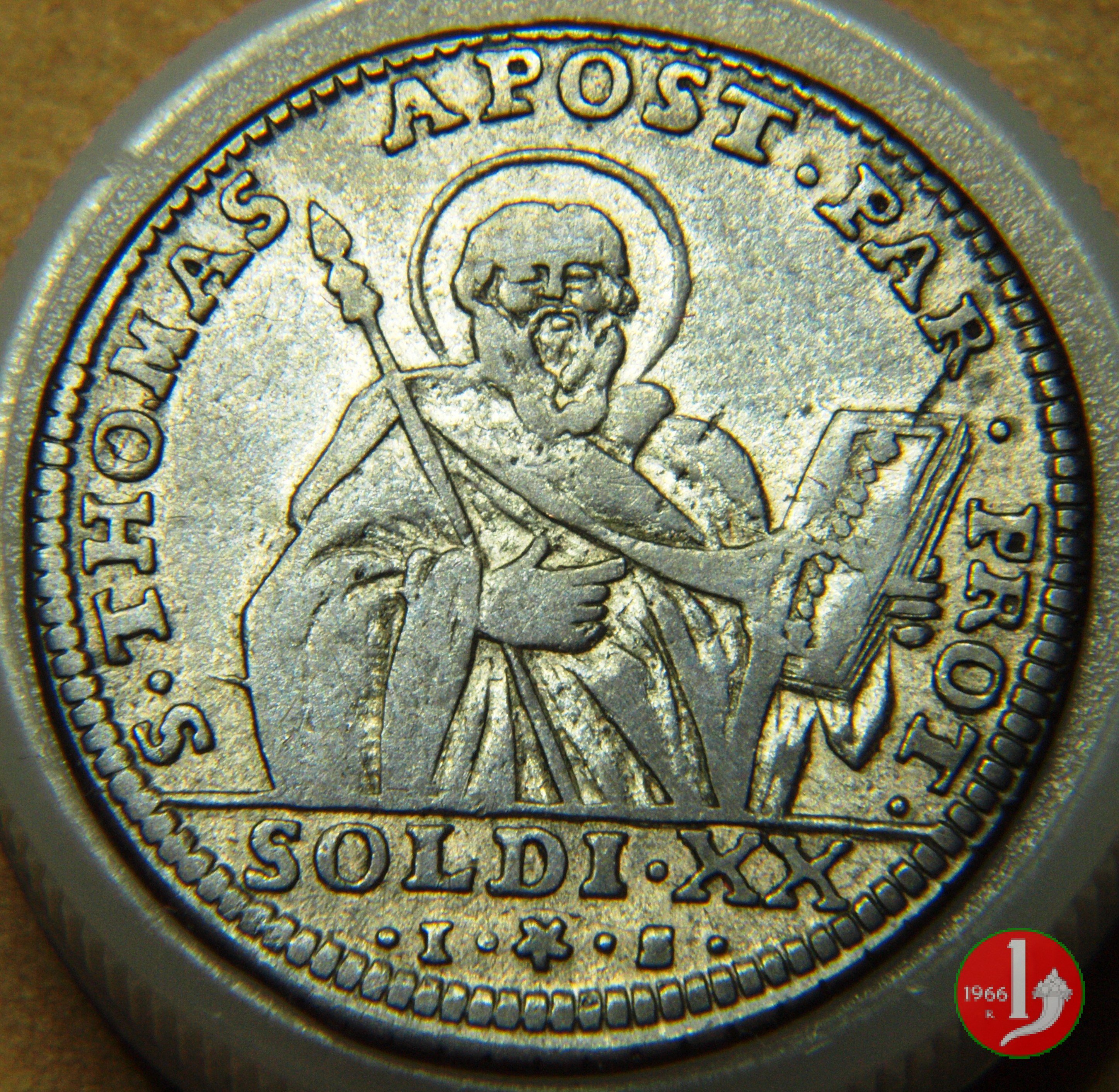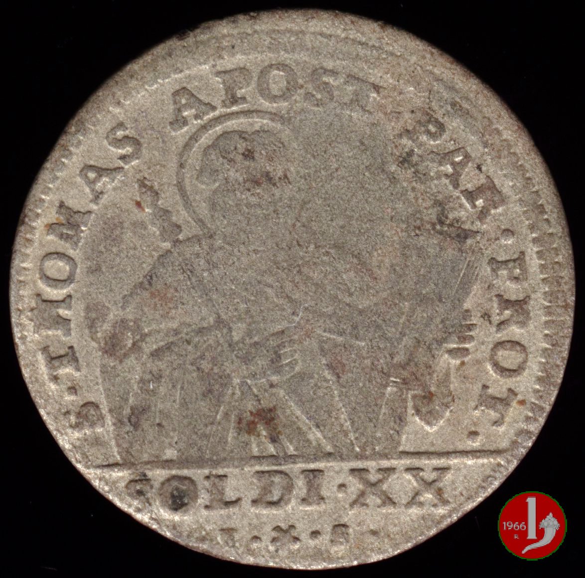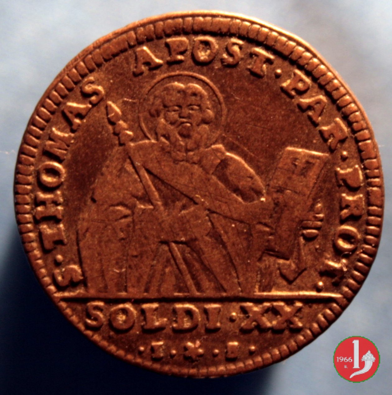 Tradizionalmente le monete da 20 soldi di Parma rappresentano S. Tommaso, diventato uno dei patroni della città a seguito della vittoria conseguita dall'esercito parmigiano e papalino sulle truppe del Re di Francia Francesco I il 21 dicembre 1521 (a Parma ricorrenza di S. Tommaso).