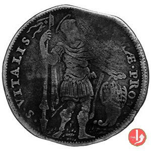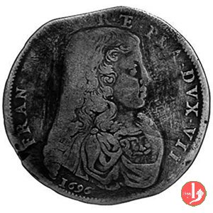 Busto corazzato a destra, intorno FRAN • FAR • PAR • ET • PLA • DVX • VII •. Sotto il busto indicazione del millesimo (1696). Figura di San Vitale in armatura con vessillo nella mano destra e scudo riportante lo stemma farnesiano nella mano sinistra. Ai lati dello scudo sigla dello zecchiero (GG per Giovanni Gualtieri). Intorno, S • VITALIS PARMAE • PROT •