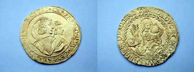 Busti affiancati della reggente e del duca rivolti a destra, intorno: croce CHR • FR • HYAC • DUCES • SABAU • P • P • PED • R • R • CYPRI Immagine della madonna dei fiori di Brà in cerchio di rami di lauro, intorno DEDUCET NOS MIRABILITER DEXTERA TUA
