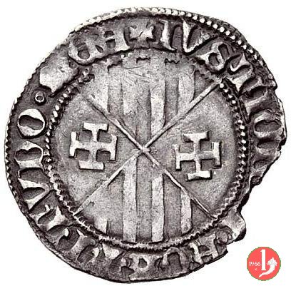+ FERDINANDVS ° D ° G ° R ° SICILIE°; Il re seduto su trono frontalmente tra due protomi di leone. + IVSTICIA ° E ° FORTITVDO ° MEA; Campo inquartato diagonalmente, con pali d'Aragona e croci potenziate.