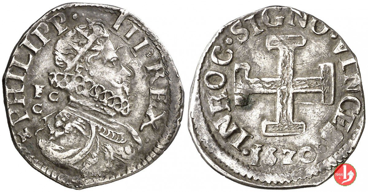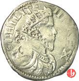PHILIP • III • REX, Busto del Re radiato con ampio collare volto a dx. Dietro e avanti eventuali sigle. . IN HOC • SIGNO • VINCES •, Croce potenziata, sotto la data.