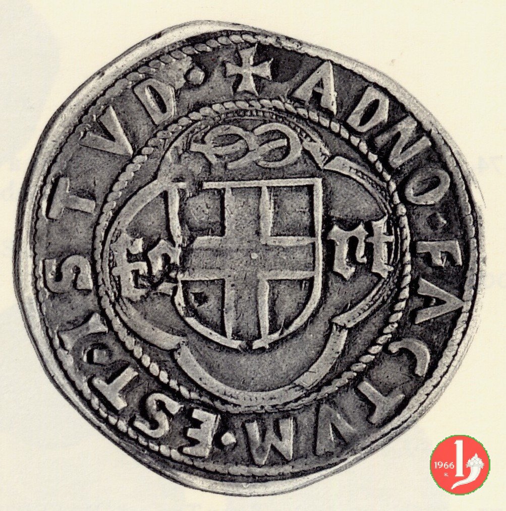 Busto del duca rivolto a destra, con il berretto, intorno: croce PHILIPUS • DUX • SABAUDIE • VII • sigle Scudo sabaudo con ai lati lascritta FE RT in gotico, sopra un nodo savoia, il tutto in una cornice quadrilobata perlinata, intorno: croce ADNO • FACTUM • EST • ISTUD