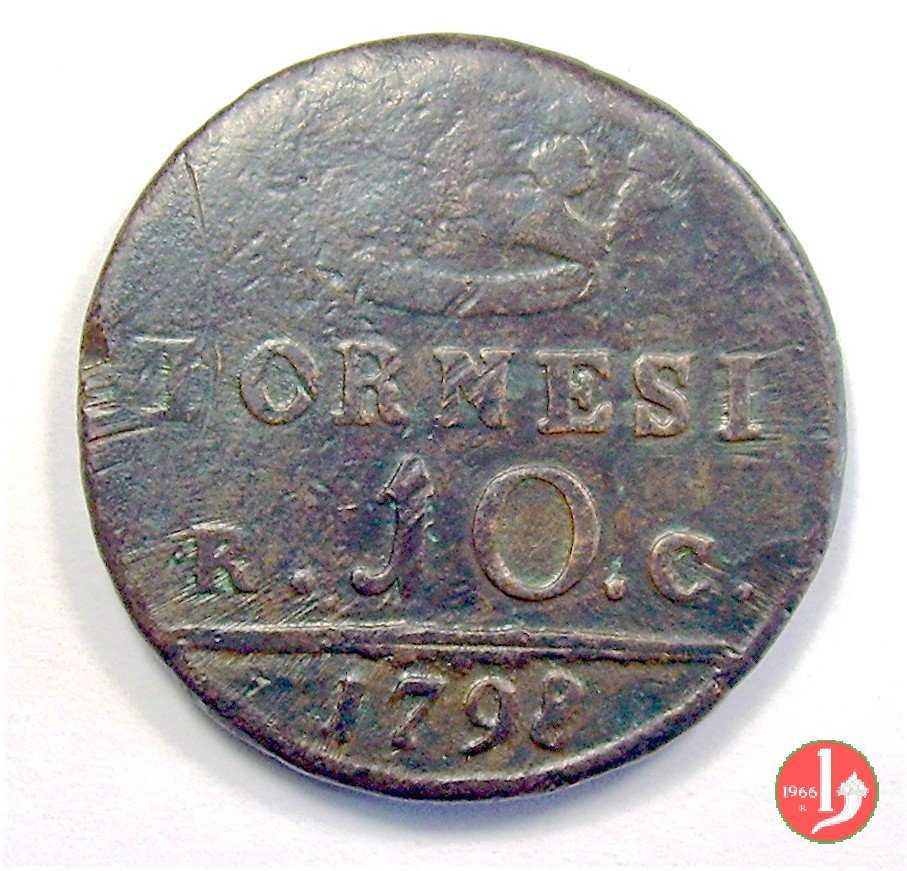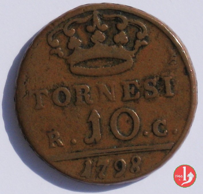 FERDINAN • IV • SICILIAR • REX, testa volta a dx del re, sotto sigla P. Corona reale, sotto, su due righe, TORNESI / R • 10 • C •, in esergo la data.