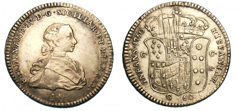 FERDINAND • IV • D • G • SICILIAR • ET HIER • REX • , busto infantile del re volto a dx, sotto sigle IA. HISPANIAR INFANS • 1760, stemma coronato, ai lati le sigle C • - C • /R •, in basso l'indicazione del valore G • 60.