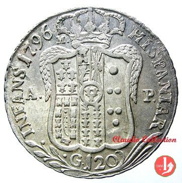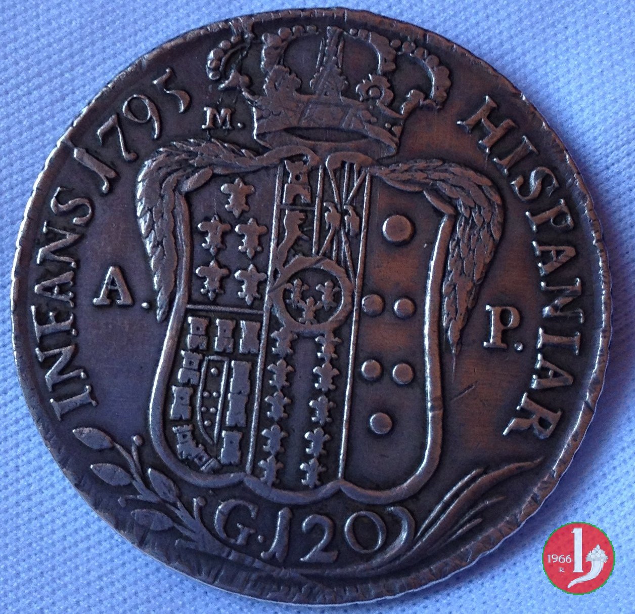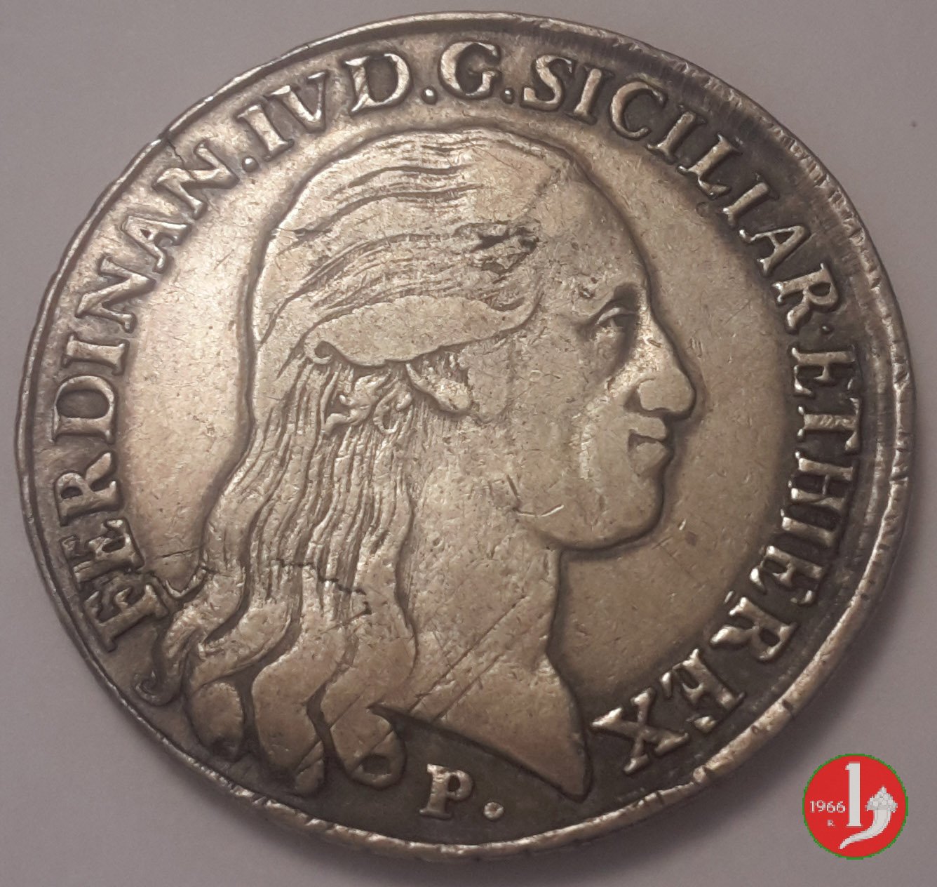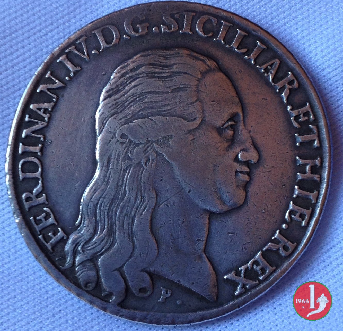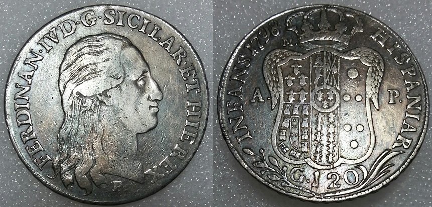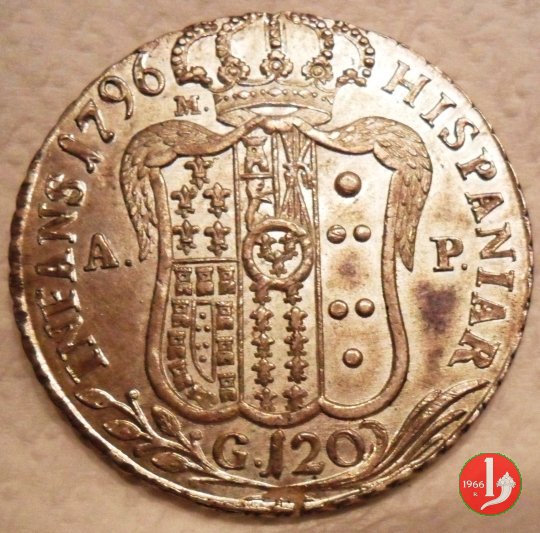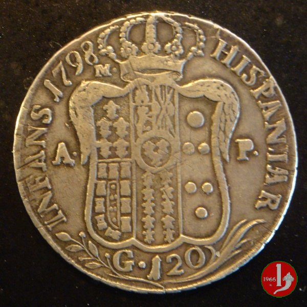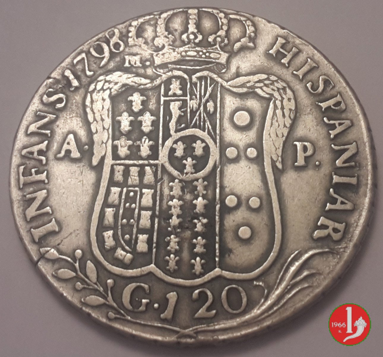 FERDINAN • IV • D • G • SICILIAR • ET HIE • REX, busto volto a dx, sotto sigla P HISPANIAR INFANS e la data, stemma coronato con ai lati le sigle M • A • P • in basso l'indicazione del valore G • 120