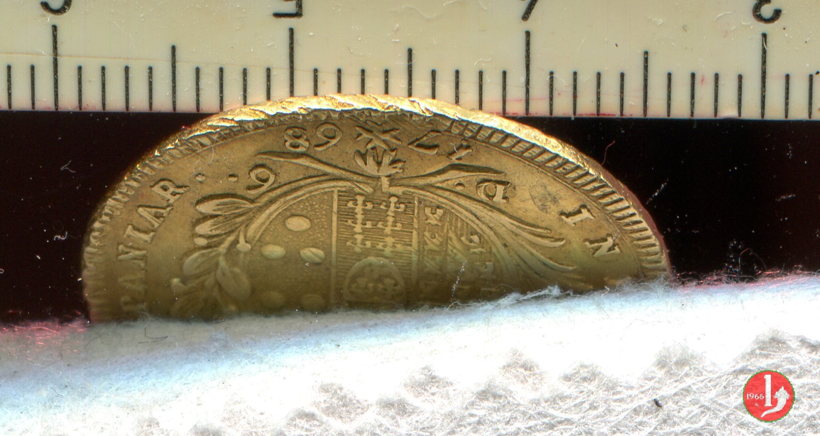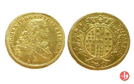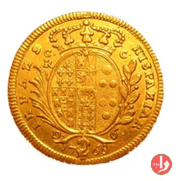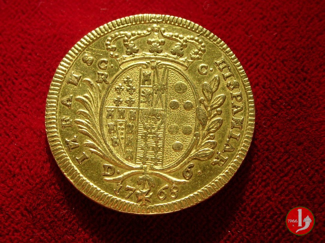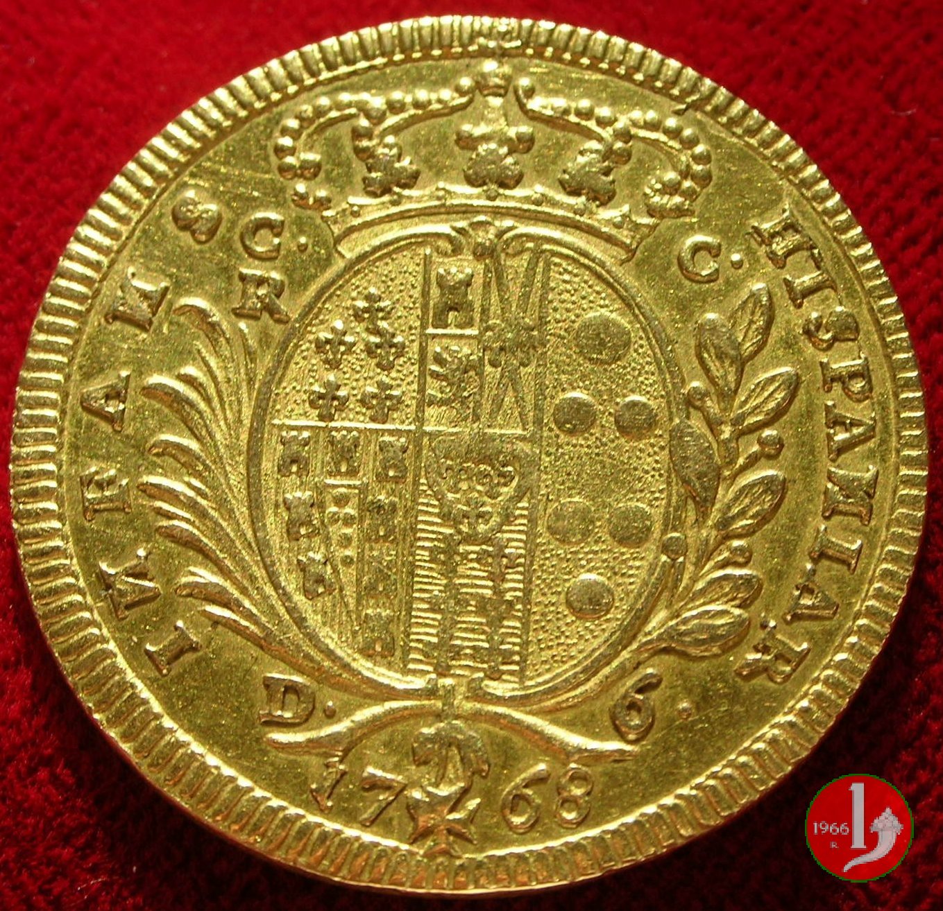 | Il terzo tipo dei 6 ducati raggruppa lo "stemma ovale senza collare" (Pannuti Ricco 13 - 16). Il 1768 presenta l'inedita sigla di BP per Benedetto Domenico Perger. Al diritto il busto semiadulto e poi adulto, mentre il rovescio è di stile "transitorio" ove la cartella barocca è sostituito un piú sobrio scudo ovale tra i due rami e senza il collare. | ||||||||||