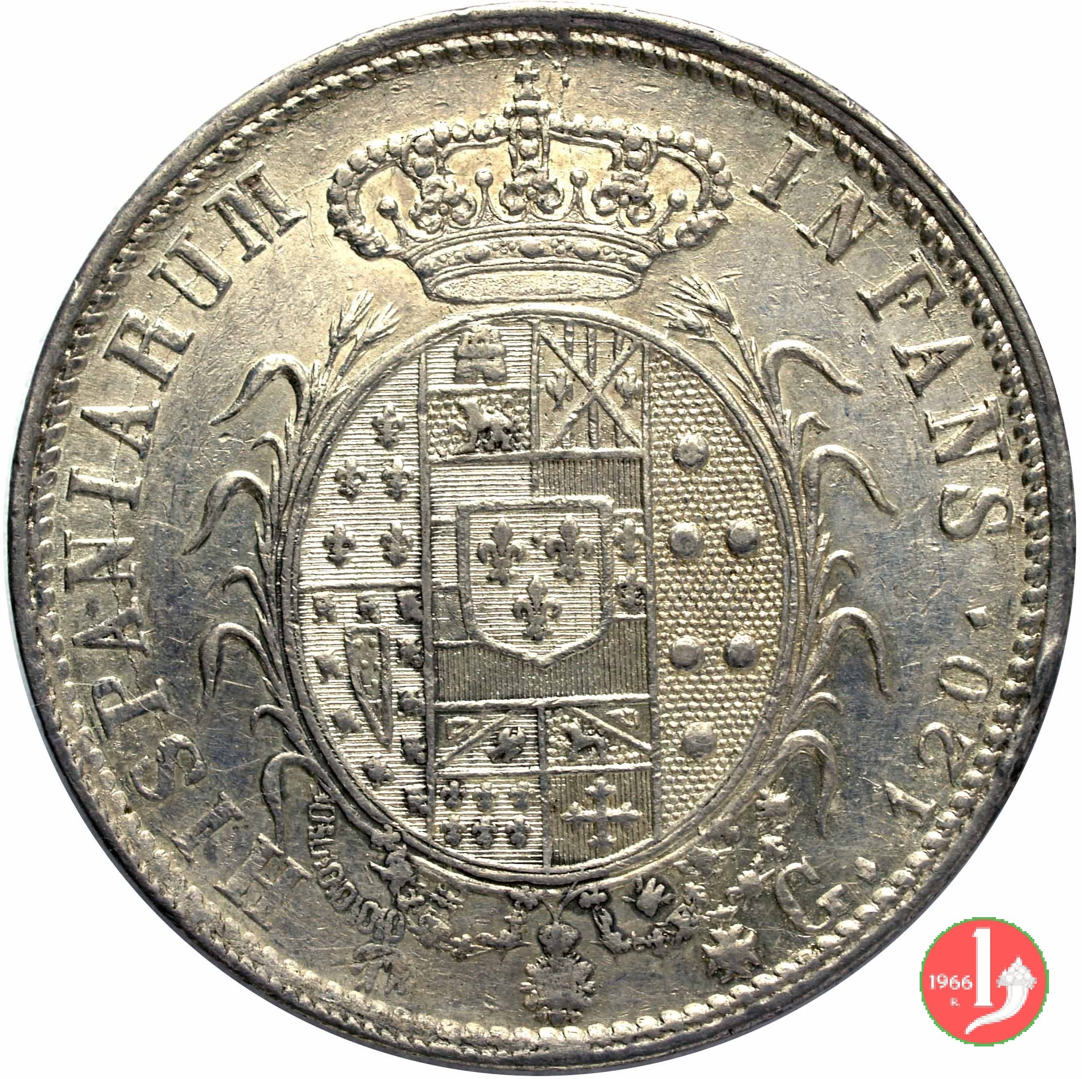 | Si differenzia dal tipo solito per i capelli a cresta del sovrano e per le brattee al rovescio. Le piastre con la R sono reimpresse su monetazione precedente, generalmente della Repubblica Napolitana o Napoleonica. Numerose sono le varianti di conio per interpunzonatura e differenze nel giro della leggenda. | |||||||