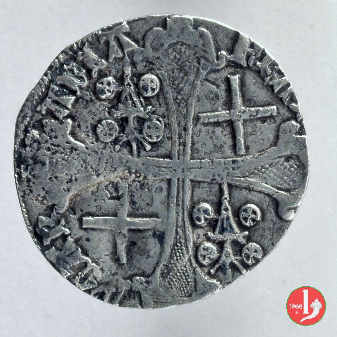 Croce gigliata che divide la leggenda in quattro parti accantonata 1 e 4 carro, 1 e 3 croce.