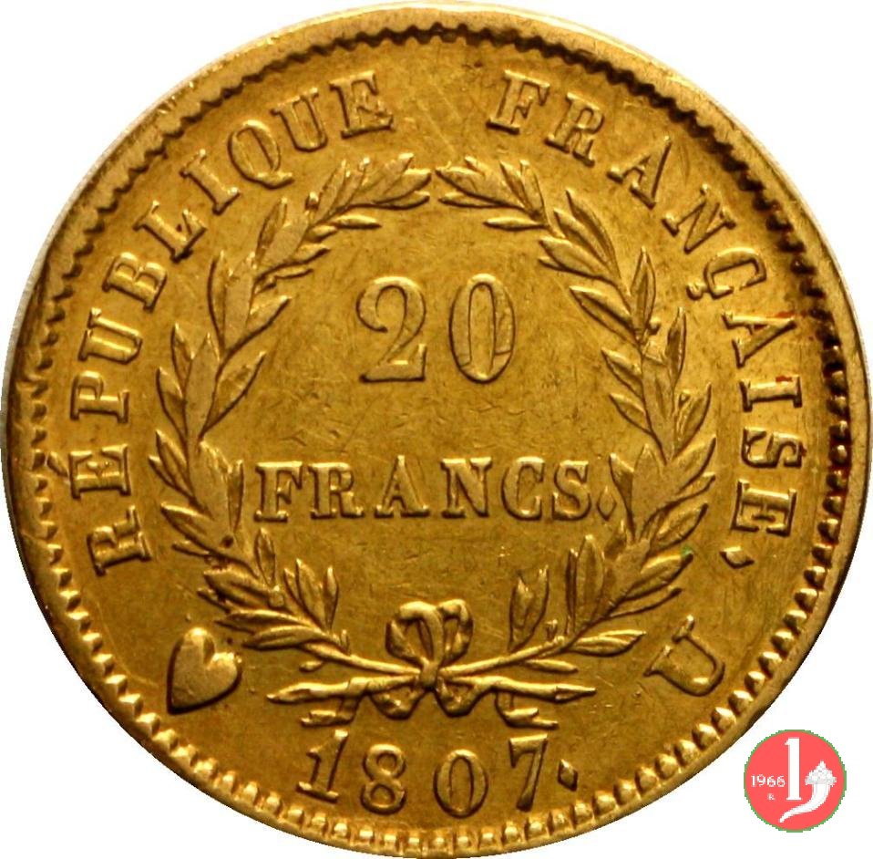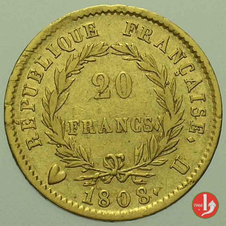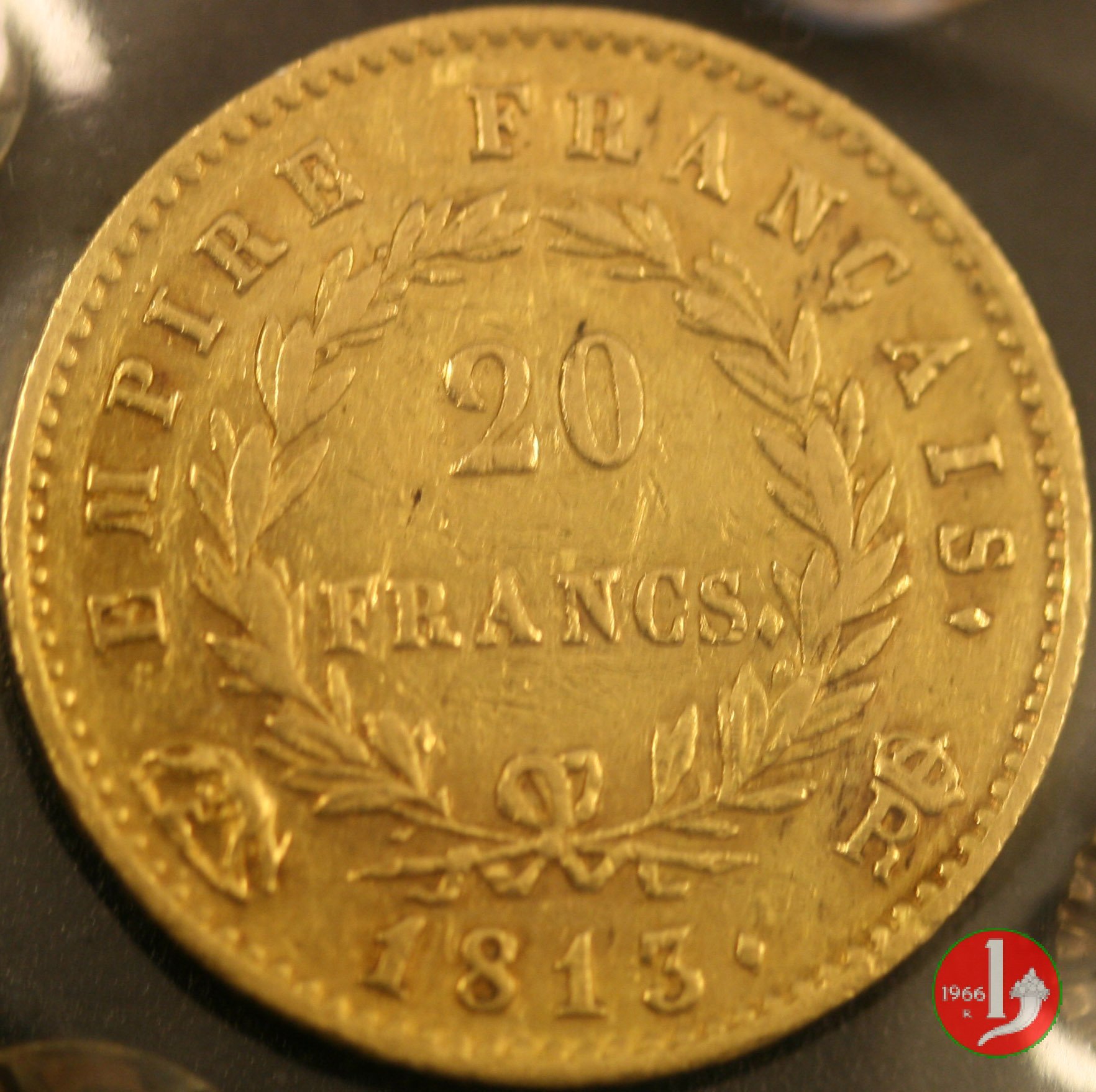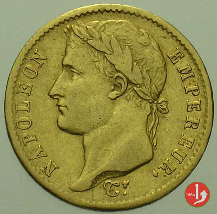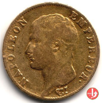 Indicazione del valore (20 FRANCS •) su due righe tra fronde di lauro. Intorno, nella parte superiore, REPUBLIQUE FRANÇAISE • nella parte inferiore in senso antiorario, il simbolo del maestro di zecca, indicazione del millesimo, un • e segno di zecca. Testa di Napoleone Bonaparte rivolta a sinistra, intorno NAPOLEON EMPEREUR •. Sul taglio del collo indicazione dell'autore (DROZ F •), sotto indicazione dell'incisore (T • in corsivo per Tiolier).